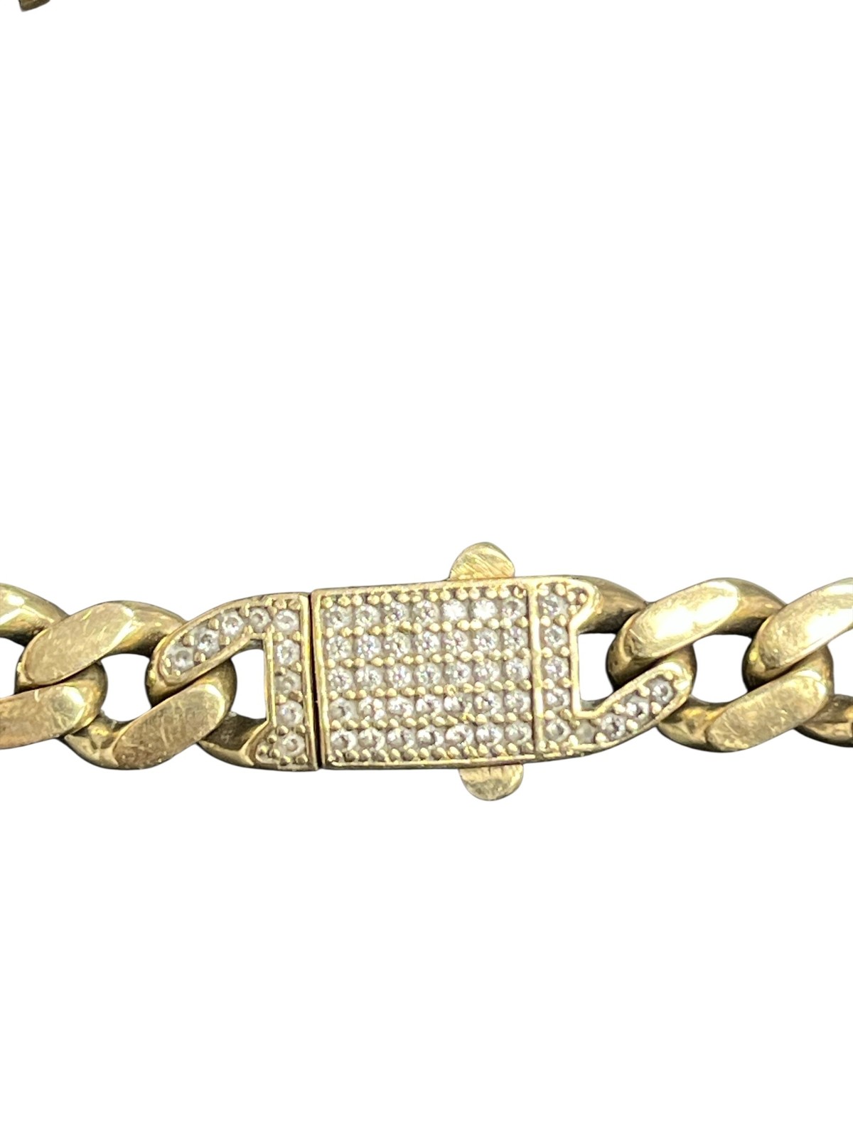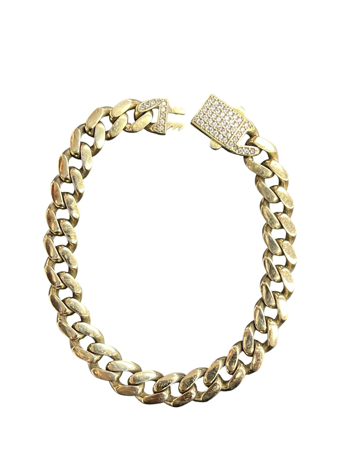 Type: BraceletWeight: 8.7Karat: 14ktMetal: Yellow GoldGender: UnisexStyle: CubanSize / Length: 7"Owner applied: 14KStone 1 quantity: 53Stone 1 shape: RoundStone 1 color: ClearStone 1 weight (total): .60Stone 1 type: Cubic ZirconiaCondition:Used