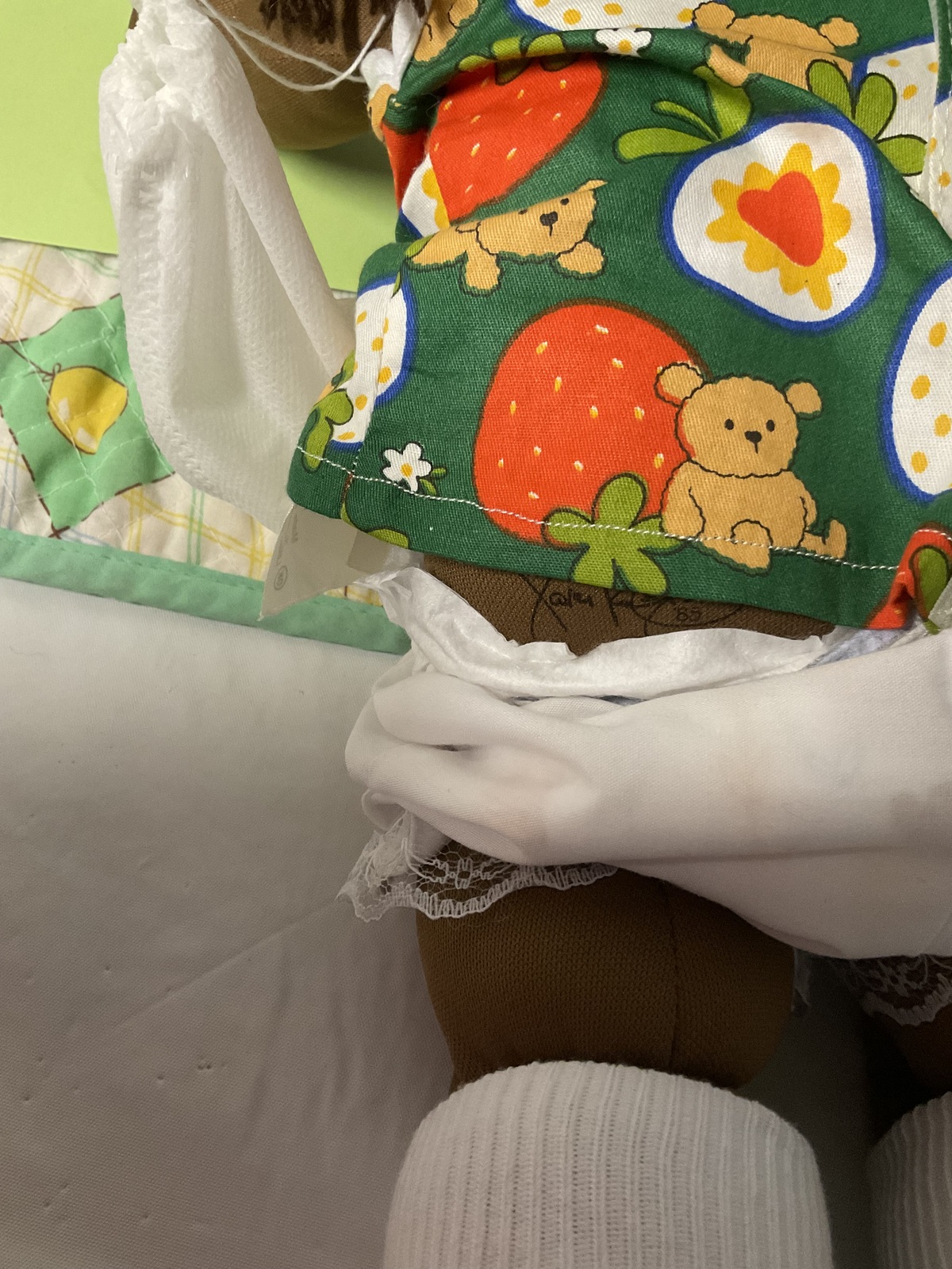 This little sweetie is in beautiful condition, with sparkling clean hair and bright eyes, wearing a lovely lace-trimmed handmade outfit. Gorgeous and lovable !!