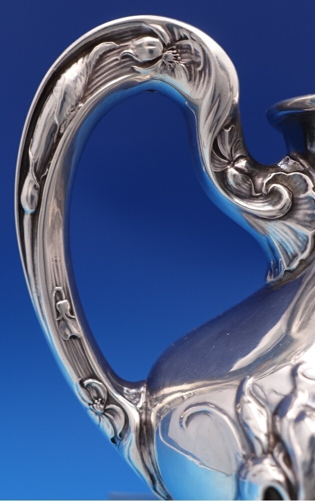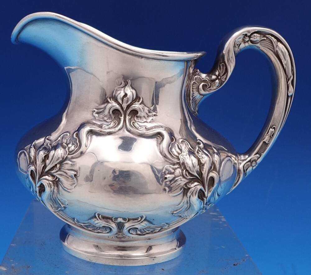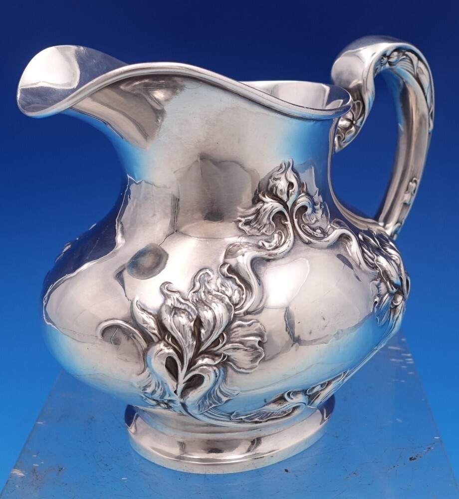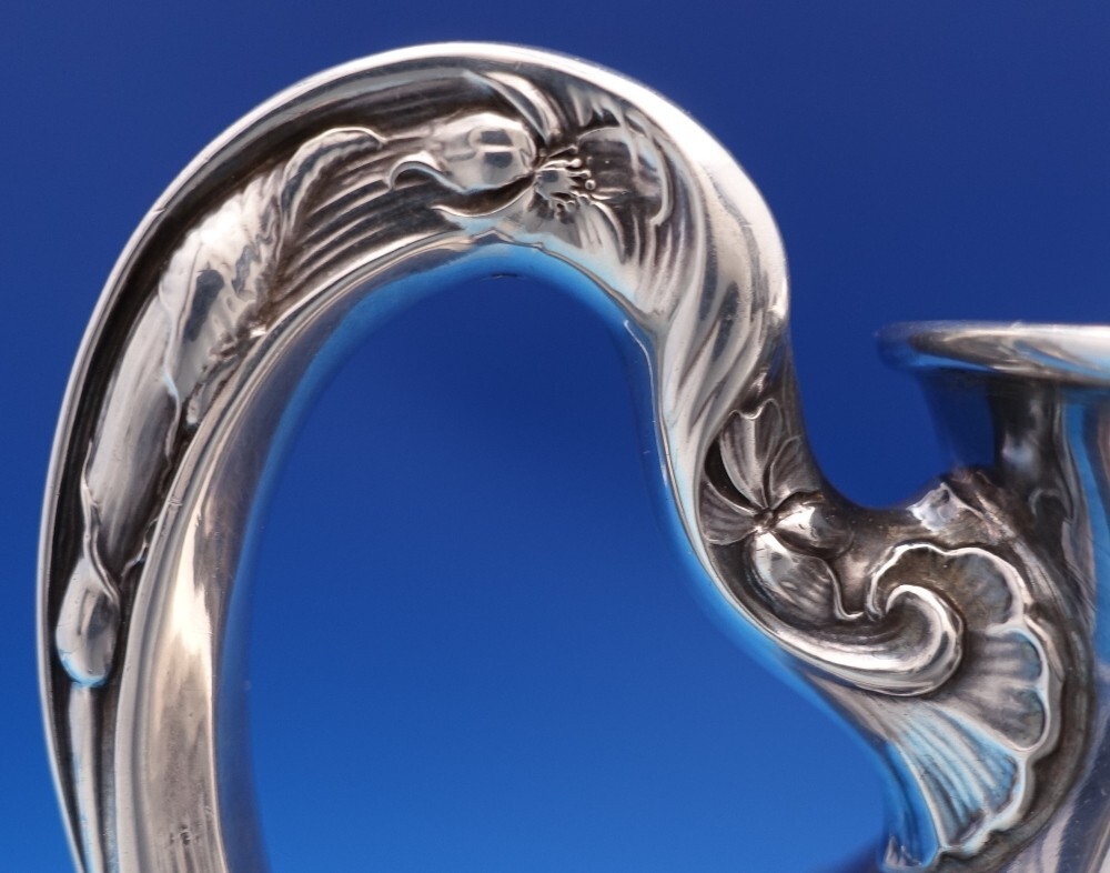 Eton by Wallace sterling silver Creamer featuring iris flowers, stamped #1160. It holds up to 7/8 pint, and it has a "C" monogram, as shown. The piece measures 5 1/2" L x 4 1/2" tall, and weighs 5.5 ozt. It is in good vintage condition. Beautiful!
