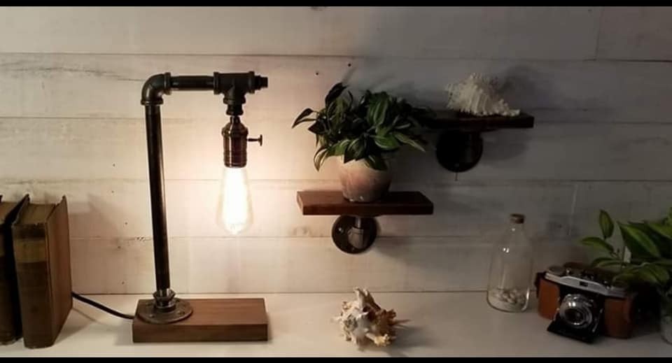 Custom made industrial lamp with Edison bulb. The lamp stand 14? tall, 8? wide and 4? deep. Comes with a 3-way light socket. I have stained the wood with a walnut stain. (Bulb is included)