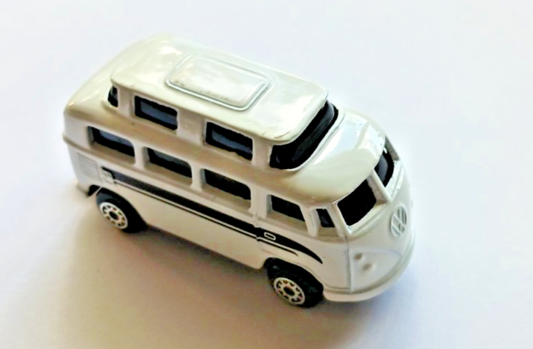In never played with condition, part of my car collection that was stored away for many years. This is perfect for anyone who loves this van. Die cast metal with plastic trim, nice white paint with stripes, hitch and 19 windows! A great representation of a the Classic VW Camper Van!