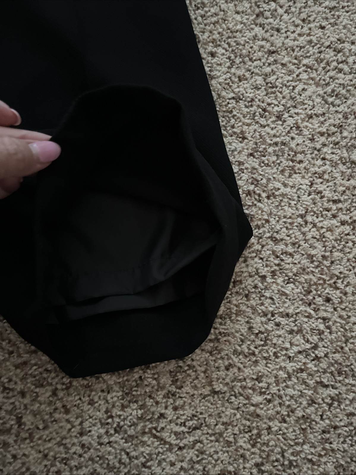 The Le Suit Essentials Black Beige Square Pattern Jacket Black Pants is a stylish and versatile addition to any woman's wardrobe. This ensemble features a regular-length jacket with a square pattern and long sleeves, perfect for any season. The set includes a pair of solid black pants made from polyester, making it easy to care for with a dry clean only requirement. The classic black color and regular fit make it a timeless and flattering choice for any occasion. Made by the reputable brand Le Suit, this blazer set is sure to elevate any outfit with its sophisticated style. The pants are a crepe fabric, not the same as jacket, but compliment one another.