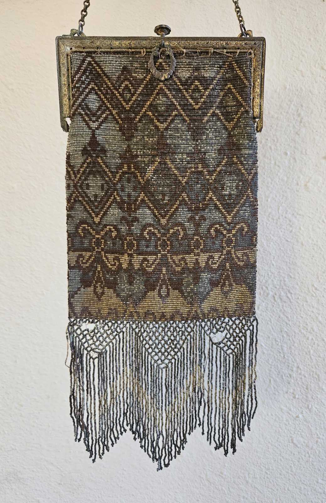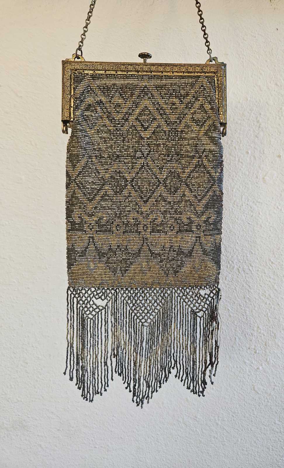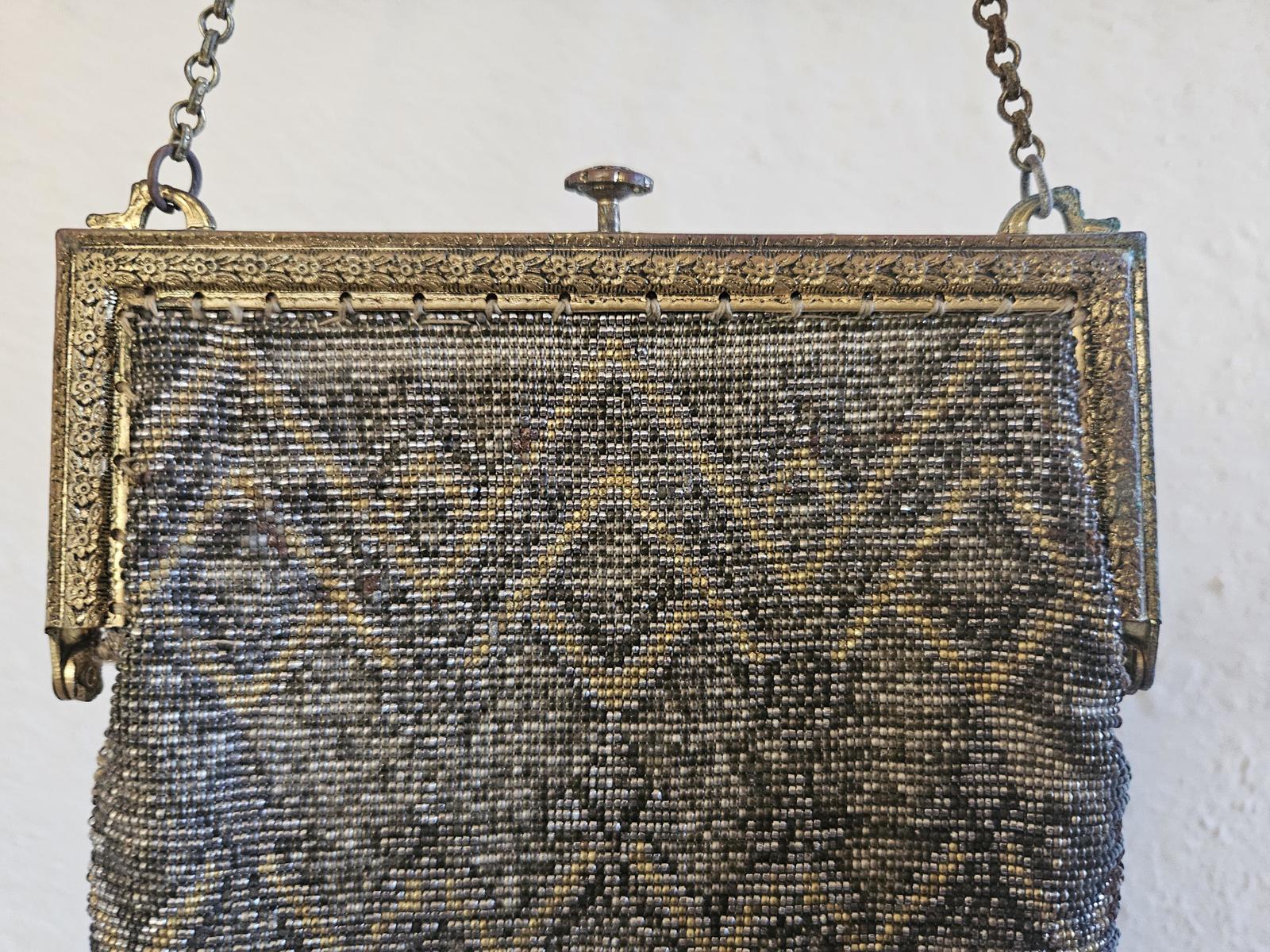 Condition: Its almost 100 years old so it's showing its age. Some missing beads on the fringe and the metal needs cleaned. The interior is worn with frayed areas and holes. Please see all photos as they are part of the description.