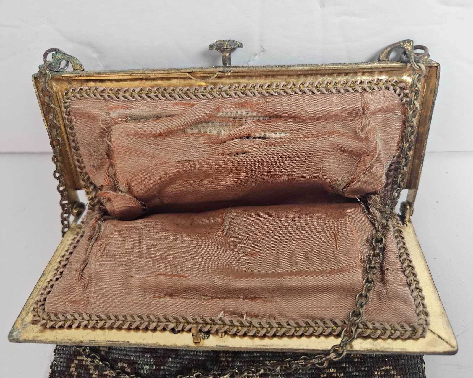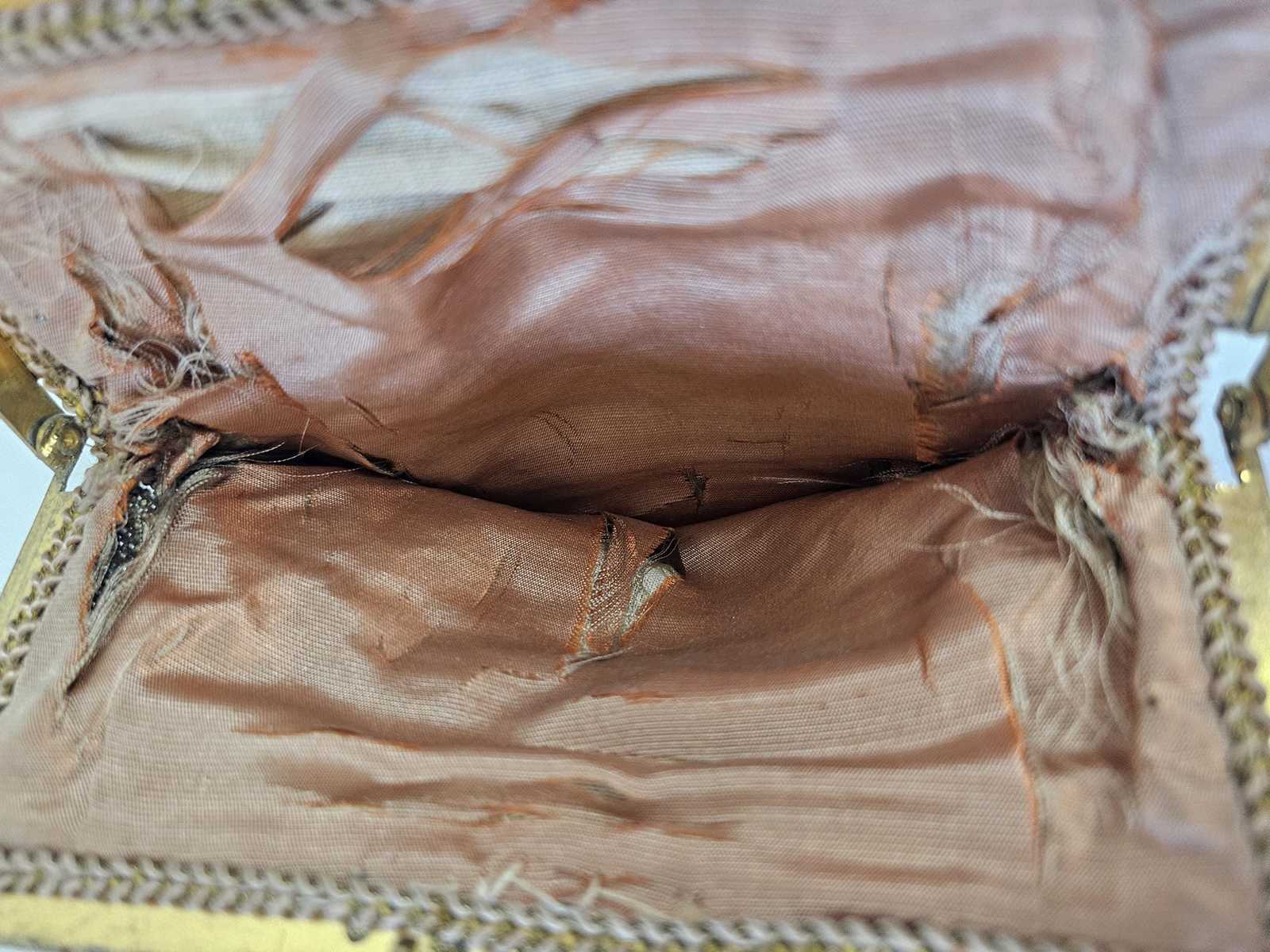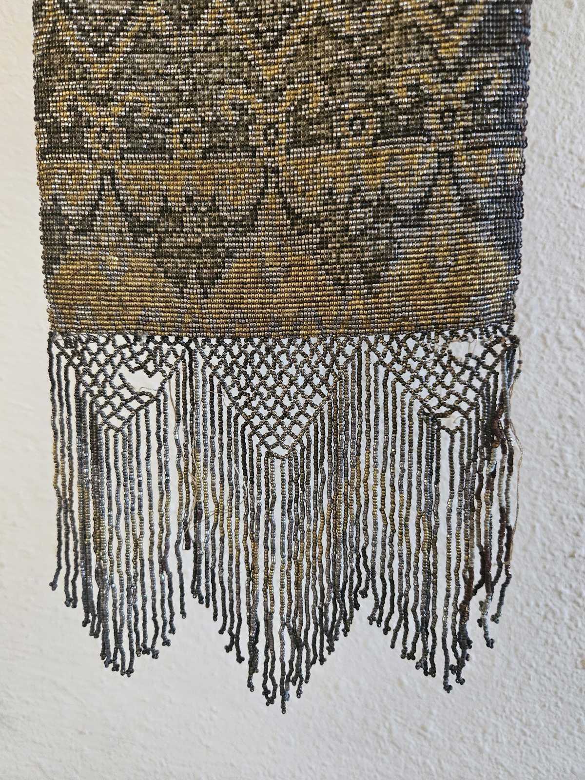 Condition: Its almost 100 years old so it's showing its age. Some missing beads on the fringe and the metal needs cleaned. The interior is worn with frayed areas and holes. Please see all photos as they are part of the description.