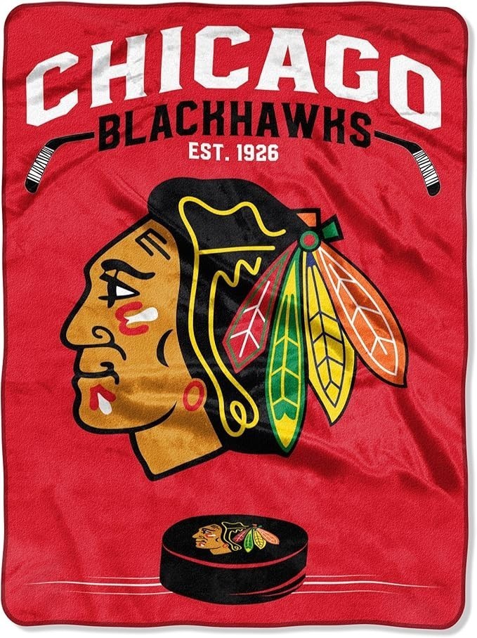 This is a 60" by 80" plush Chicago Blackhawks raschel blanket.