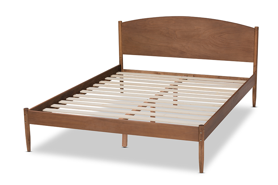 Features: Constructed from rubberwood, MDF wood, and LVL Walnut brown finish Ash walnut finish Tapered legs Slats eliminate the need for a box spring Solid and Quality Construction Set Includes: One (1) Queen Size Bed