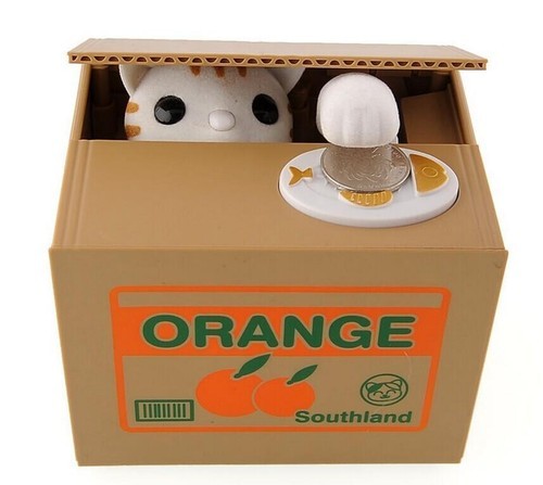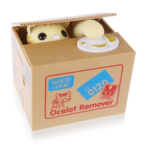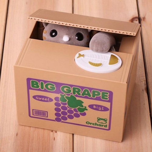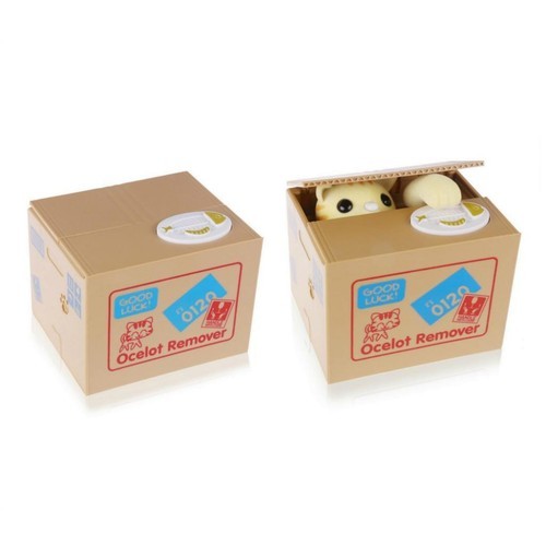 This super fun coin bank features a sneaky mechanical cat that quickly pops from the box to 'steal' your coins and then disappears with a meow!