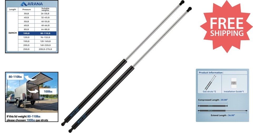 Upgrade your heavy-duty applications with the ARANA P8155 struts. Designed with an extended length of 36" (914mm) and a compressed length of 20" (508mm), these struts provide a force of 100Lbs (445 N) per strut, with two struts included in each set. Ideal for camper shells, RV bed storage lids, tonneau covers, and other rugged uses. Please verify your existing strut's interchange number and dimensions before purchase to ensure compatibility. Enjoy peace of mind with 18 of support for any questions, installation guidance, or satisfaction concerns. To ensure fast and reliable delivery, we work with multiple fulfillment partners and suppliers. Depending on availability and location, your order may ship from different warehouses or arrive in packaging that varies from item to item. Tracking details are typically provided shortly after shipment, and customer satisfaction remains our top priority. Please note that due to carrier policies and regional regulations, certain items may not be eligible for delivery to specific states or territories.