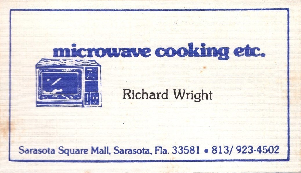 Up for sale is a charming vintage business card from the now-defunct "microwave cooking etc." store, once located in the Sarasota Square Mall, Sarasota, Florida (Zip: 33581). This nostalgic piece of ephemera features a bold blue illustration of a retro microwave oven and the name Richard Wright, likely the store owner or representative.