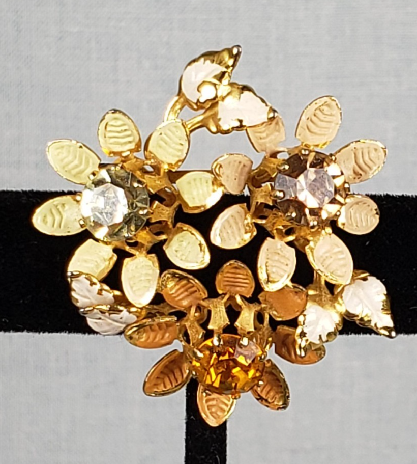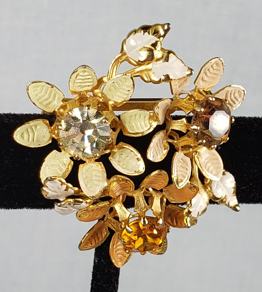 Mid Century Enamel Amber Blue Purple Rhinestone Gold Tone Floral Bouquet Brooch