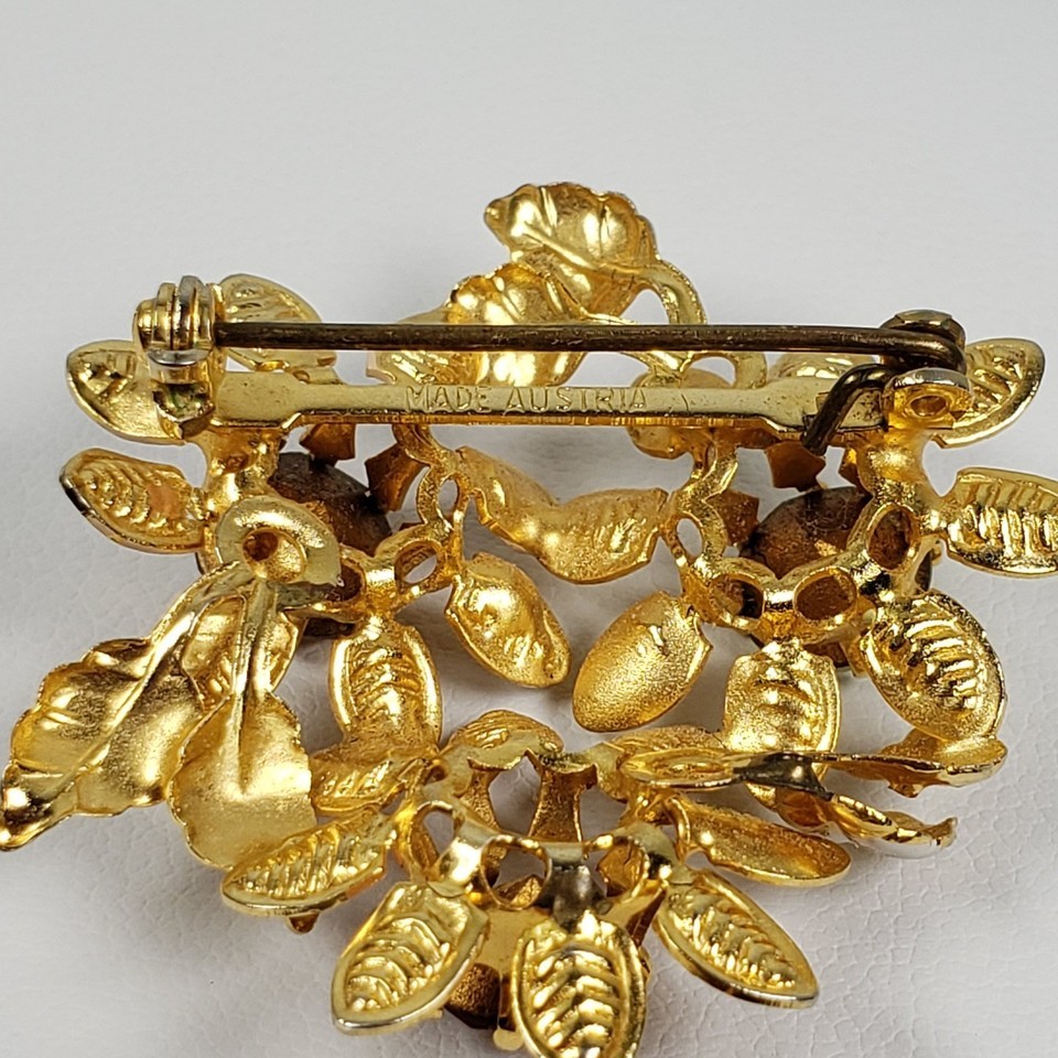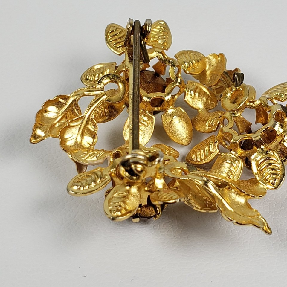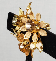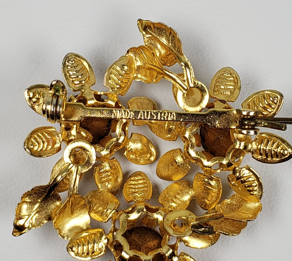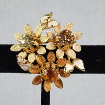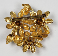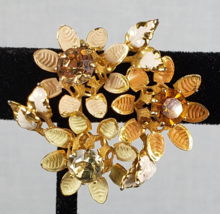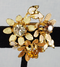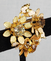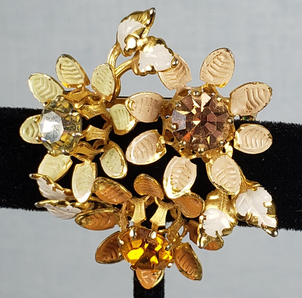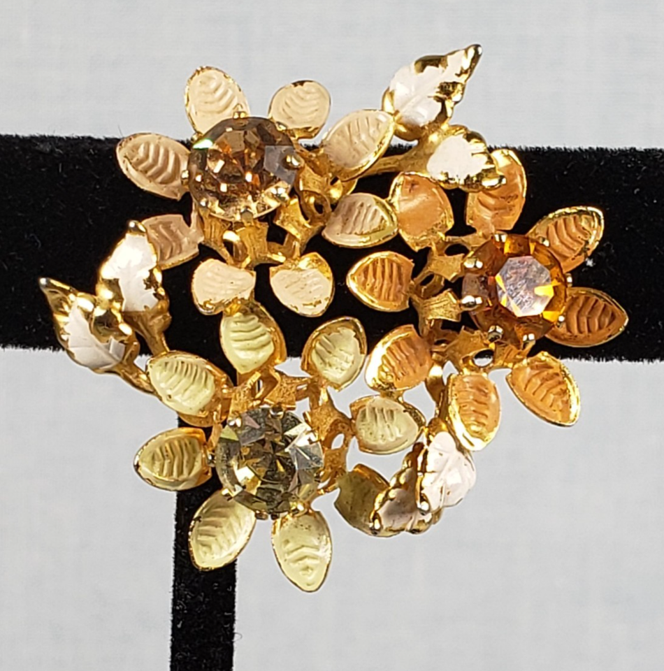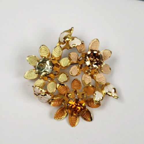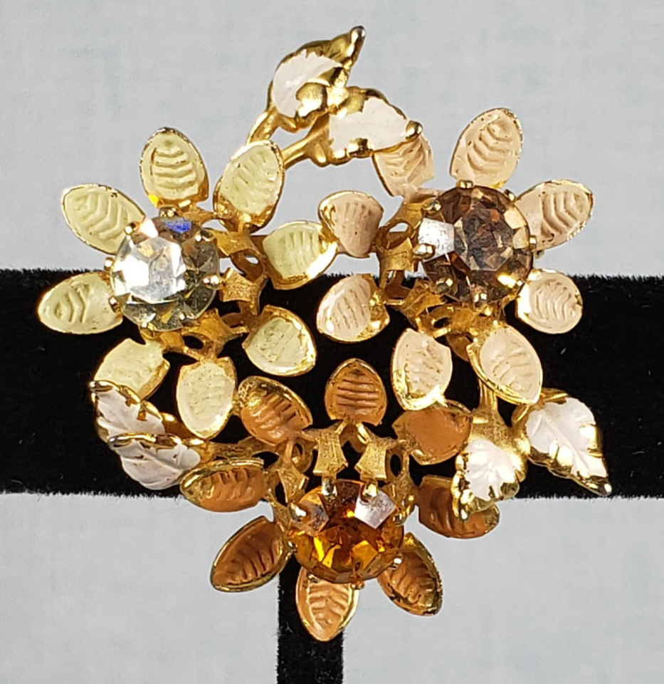 Vintage Mid Century Enamel Amber Blue Purple Rhinestone Gold Tone Floral Bouquet Brooch