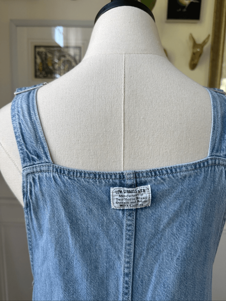 Levi?s Tico denim overall jumper dress with adjustable straps, open sides and hip pockets. Logo buttons and brand patch at the back. The bus measurement is free as a result of the open sides. Asset measures 46.5 inches shoulder to him, 18 inches straight across the waist and 22 inches across the hip.