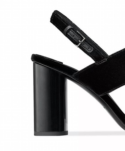 Don't be deceived, these heels are comfy as can be.Buckled ankle strap. Pave logo accent. 3.54" heel. Upper: 100% viscose; Lining and sole: 100% bovine leather; Lacquered plastic heel. True to size. Spot clean.