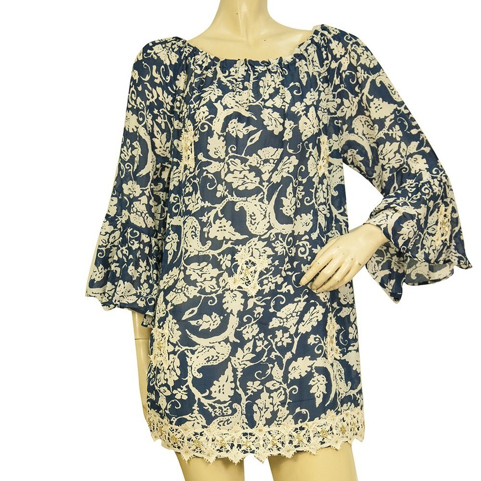 Heading on vacation? Don't leave home without this one super tunic (long top or mini dress) from Joyce girls. We love the blue color and the white paisley print, the cream cotton lace adorned with sequins and the elasticated neckline of this beautiful tunic that can be worn on and off shoulders. Slips on.