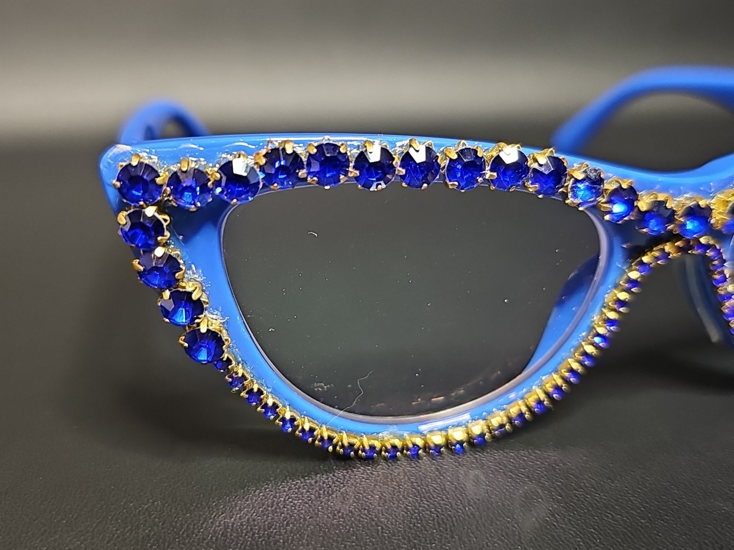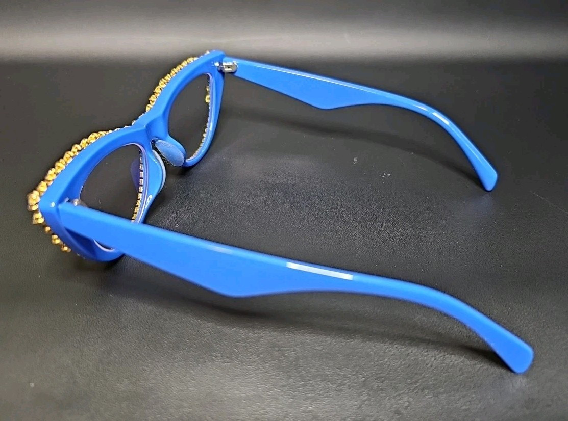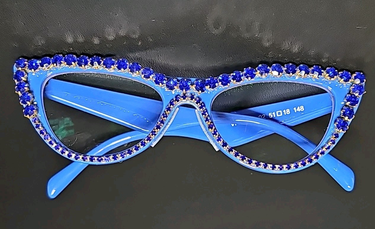 Adorned with blue rhinestones, the glittery frame takes bold to a whole new level, blending vintage cat-eye vibes with modern glam. The glossy blue temples keep things sleek, while the vibrant stones add a fun, sparkly twist. Whether you?re looking for a trendy prescription pair or some eye-catching readers, these unique frames are bound to make a statement. Step up your style game with these dazzling Cathleen glasses.