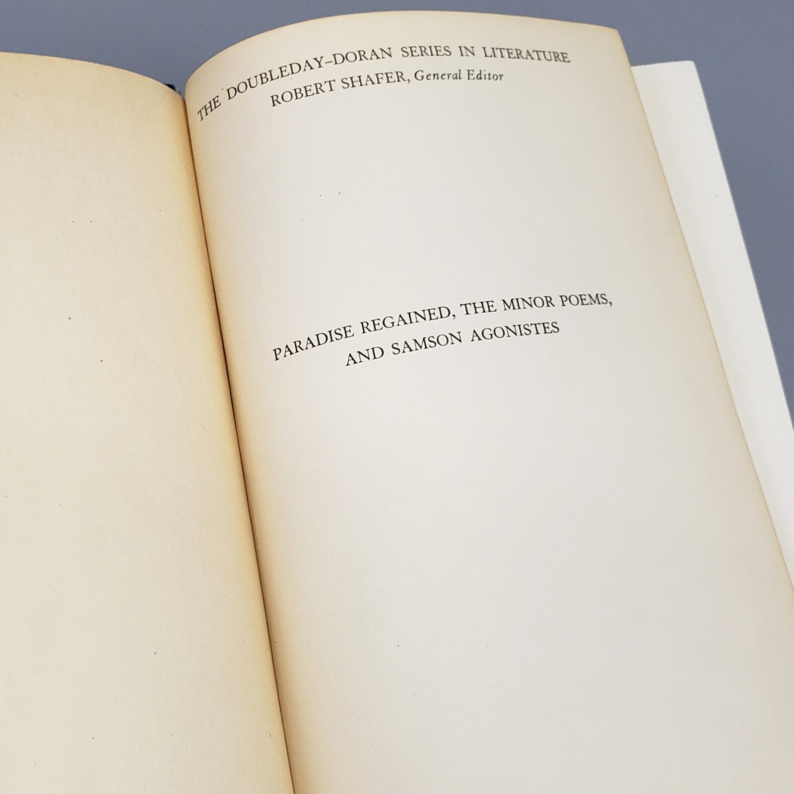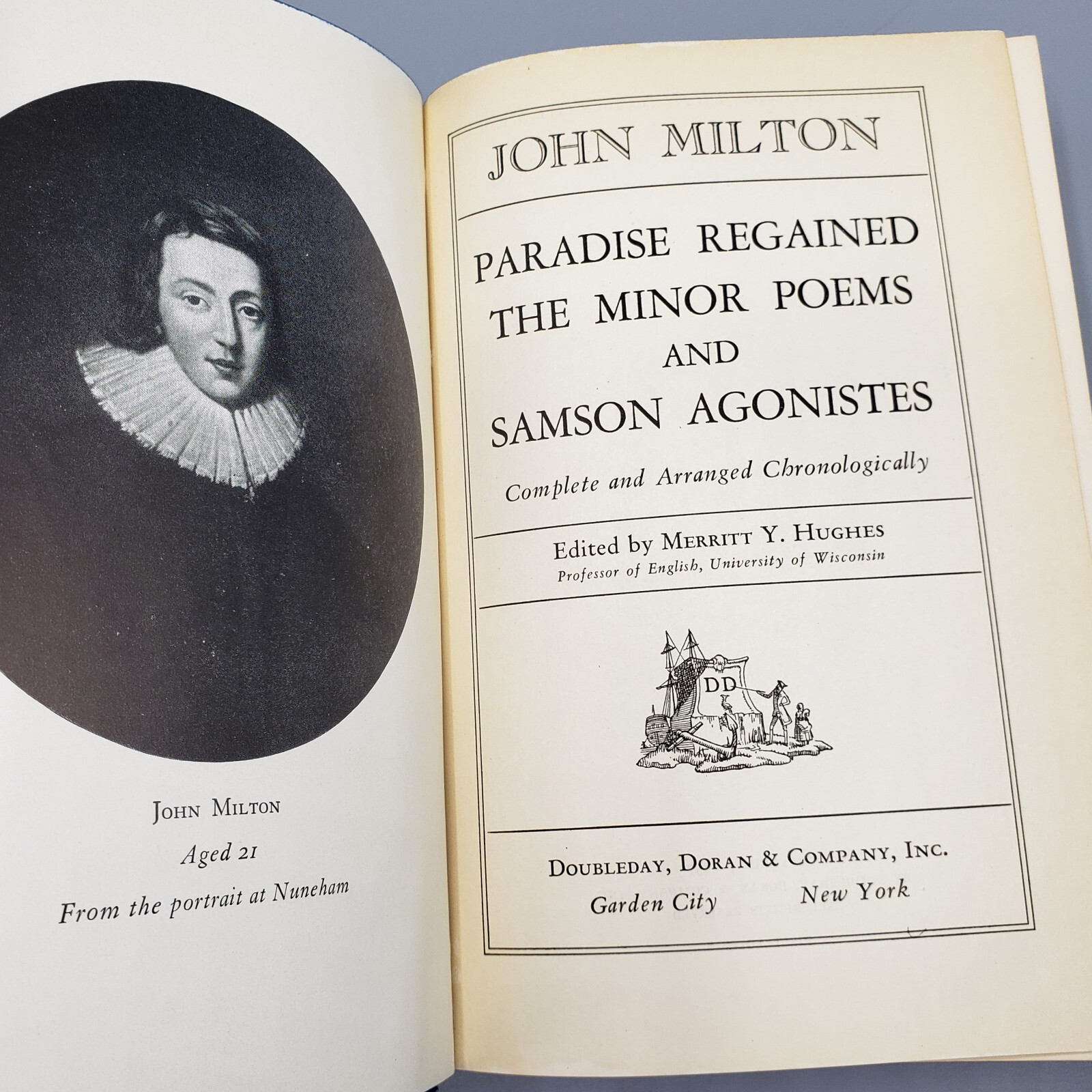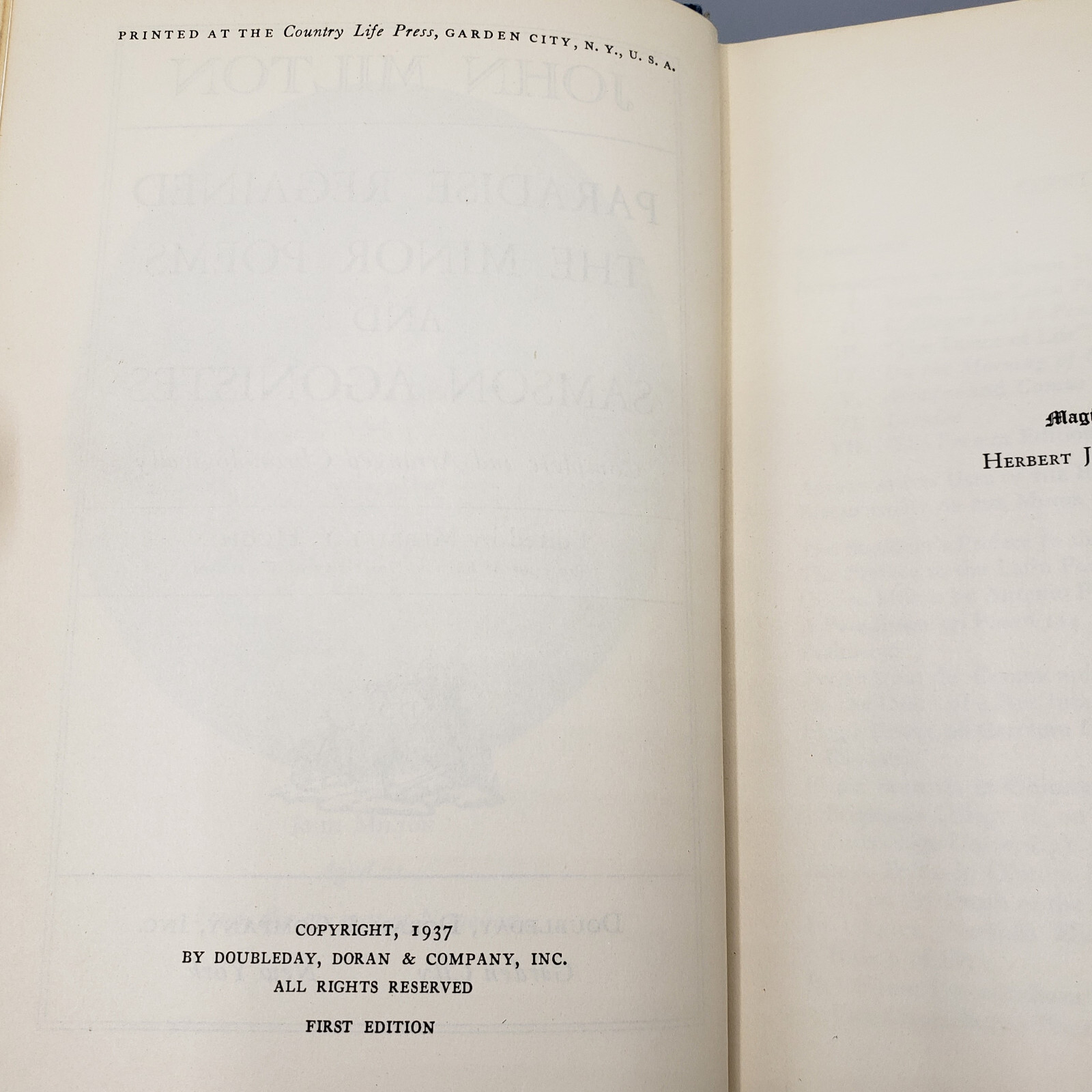 Vintage First Edition, 1st printing of Paradise Regained: The Minor Poems and Samson Agonistes by John Milton. This hardcover book was published by Doubleday, Doran Company in 1937. It was printed at the Country Life Press in Garden City, New York. The top page edges are blue and the book measures approximately 7-1/4" tall, 5" wide, 1-3/8" thick.