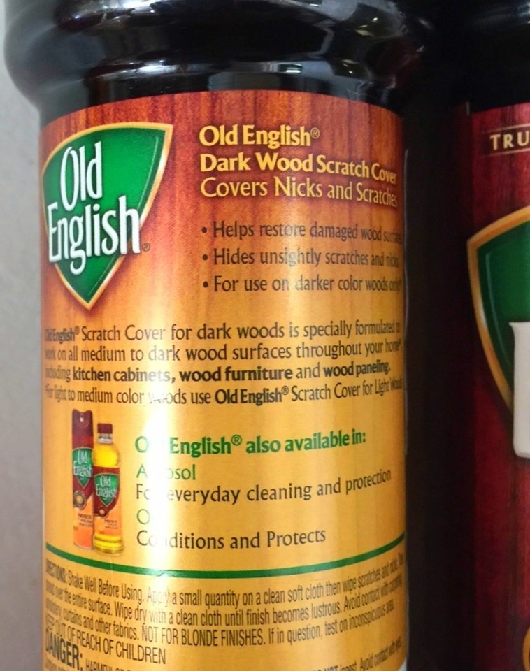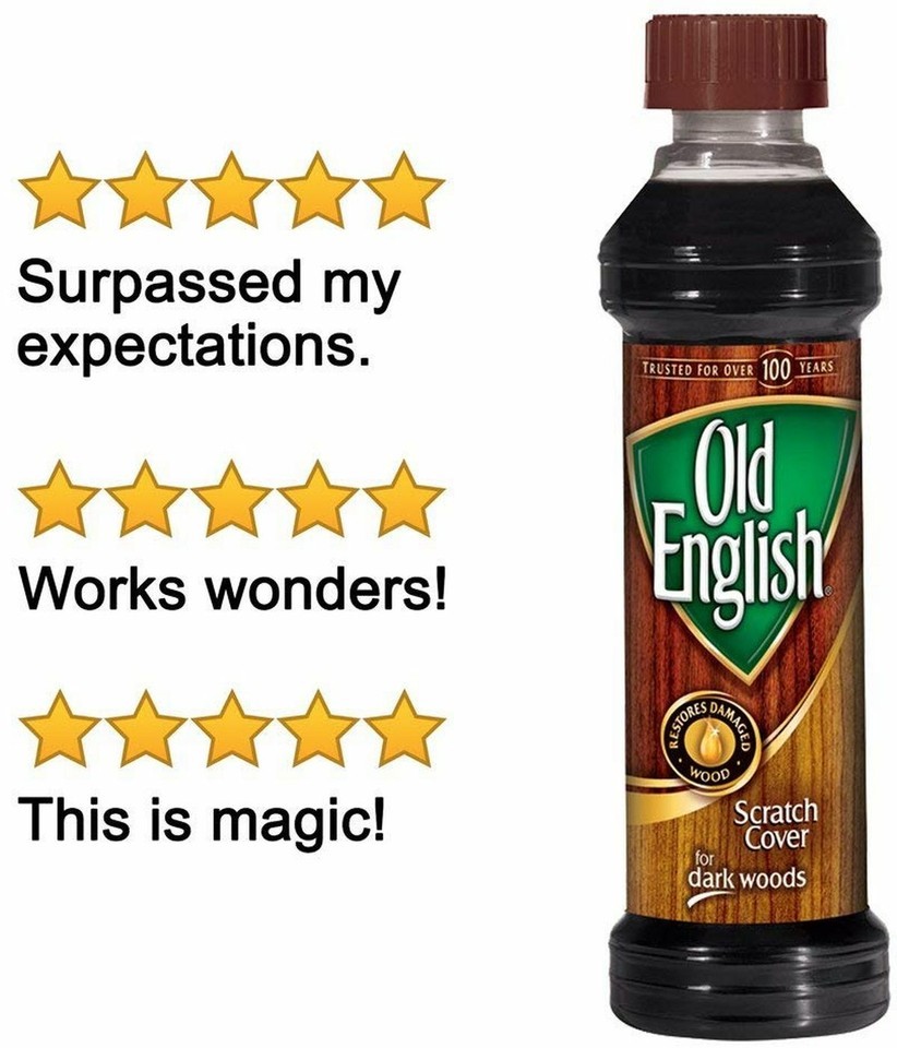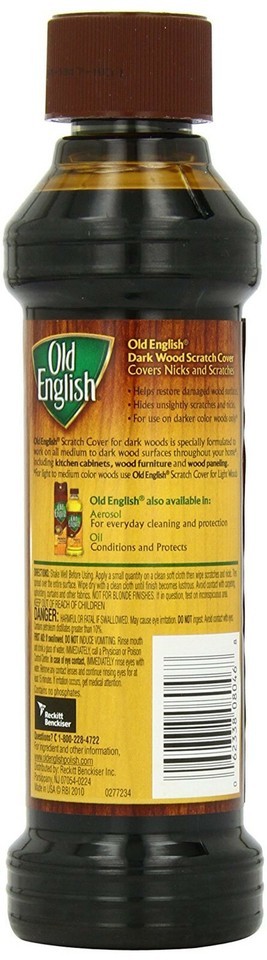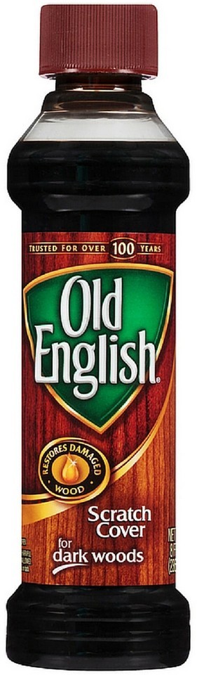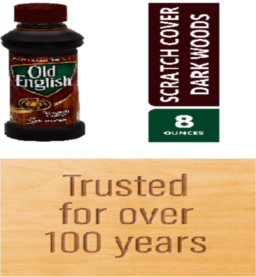 FOR SALE IS ONE (1) NEW 8 fluid ounce BOTTLE OF OLD ENGLISH BRAND SCRATCH COVER LIQUID FOR DARK WOODS MANUFACTURED BY RECKITT BENCKISER COMPANY MPN 08046 UPC# 062338080468. Enhance the look of your furniture by using this Old English Brand Scratch Cover For Dark Woods Polish 8 Oz. This dark brown liquid product is formulated to restore damaged wood surfaces and hides unsightly scratches and nicks, it is fast, easy and effective. Use this Old English furniture scratch cover to bring out the wood's natural beauty. It's made to work on all wood surfaces throughout your home, including kitchen cabinets, wood furniture and wood paneling. Old English wood scratch cover will make a useful addition to other furniture cleaning products. It comes in an 8 oz bottle that is easy to use and won't require multiple applications. You'll be able to avoid having to get rid of or replace certain pieces by using this liquid scratch cover. You will receive one (1) new bottle of Old English Scratch Cover for Dark woods shipped by USPS first class mail.