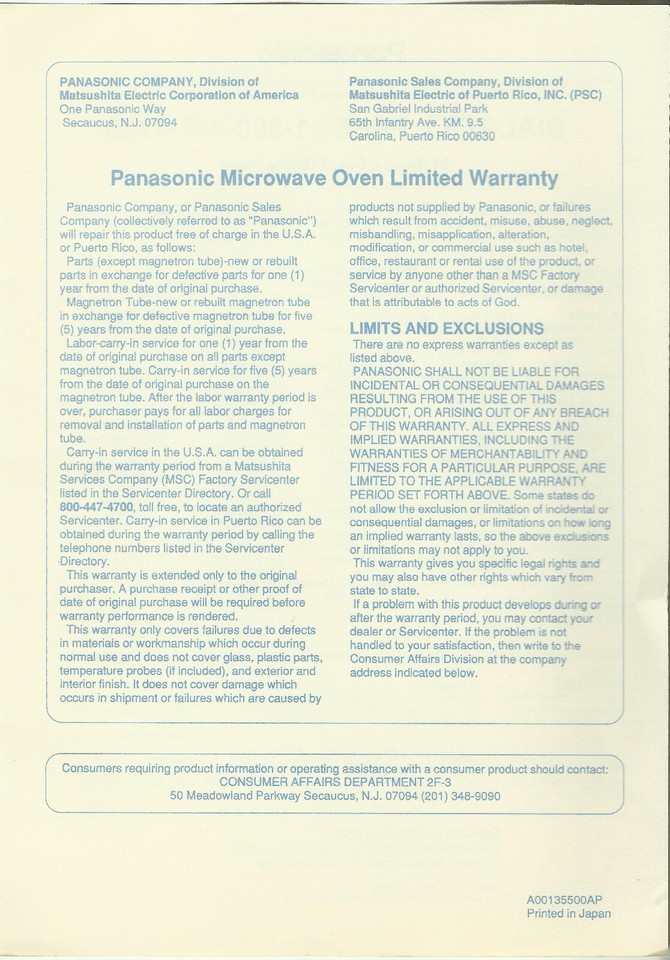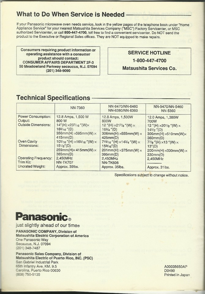 FOR SALE IS ONE (1) NEW PANASONIC COOKBOOK AND OPERATING INSTRUCTIONS FOR MICROWAVE OVEN MODEL NN-7360, NN-6470, NN-6460, NN-6380, NN-6360 (800 watts), NN-5360, NN-5470, NN-5460 (700 watts). THIS 23 page PRINTED COOKBOOK AND OPERATING INSTRUCTIONS (aka owner's manual) IS IN ENGLISH ONLY. THIS IS THE PANASONIC ORIGINAL OEM FACTORY PRINTED OPERATING INSTRUCTIONS AND WARRANTY CARD, TOTAL 2 PIECES. NO HARDWARE IS SOLD HERE, JUST THE PRINTED INSTRUCTIONS FOR THE PANASONIC MICROWAVES MENTIONED AT THE TOP. THIS PRINTED BOOK WILL PROVIDE ALL FACTORY INFORMATION FOR YOUR PANASONIC MICROWAVE OVEN INDICATED, LIKE PREPARATION, BASIC OPERATION, ADVANCED OPERATION AND USEFUL INFORMATION TO GET YOU UP AND RUNNING, AND COOKING. ALL THIS PRINTED MATERIAL CAME WITH THE MICROWAVE WHEN SHIPPED FROM THE FACTORY YOU WILL RECEIVE THE EXACT ITEM FEATURED IN THE PICTURES SHIPPED BY USPS MEDIA MAIL.....