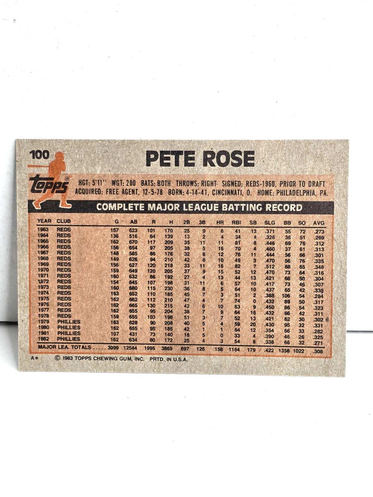 Pete Rose Phillies Baseball Card 1983 Topps No. 100 - Near Mint Condition, See Photos ... Includes FREE SHIPPING. Note the projected collectibles, vintage, antiques, and memorabilia, U.S. market shows substantial growth on-average 6.5% Compound Annual Growth Rate (CAGR) to reach $280 Billion revenue by 2033.