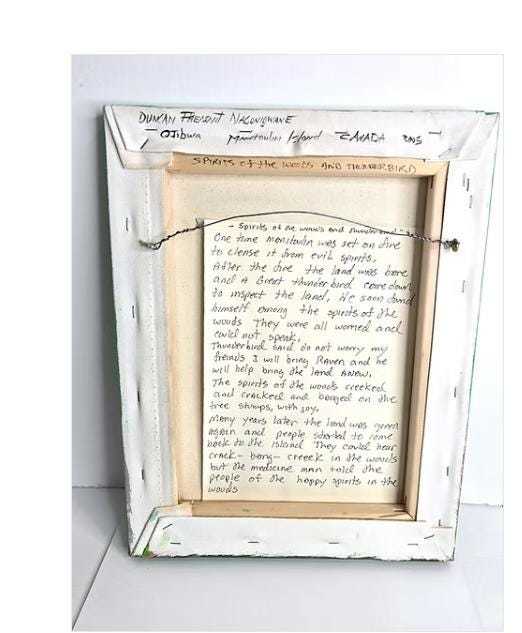 Spirit of the Woods and Thunderbird Painting Oil on Canvas Signed by Artist, Duncan Frieasnnt Naconginwane, Mountain Island Canadian Native - Rare Native Art Original, Good Condition See Photos - Measures 14" H x 11" W ... Includes note hand written by artist and FREE SHIPPING - Original 100% hand painted, artist signed painting. Note market on-average for fine art 6.5% annual return rate, projected to hit $115 billion by 2032.
