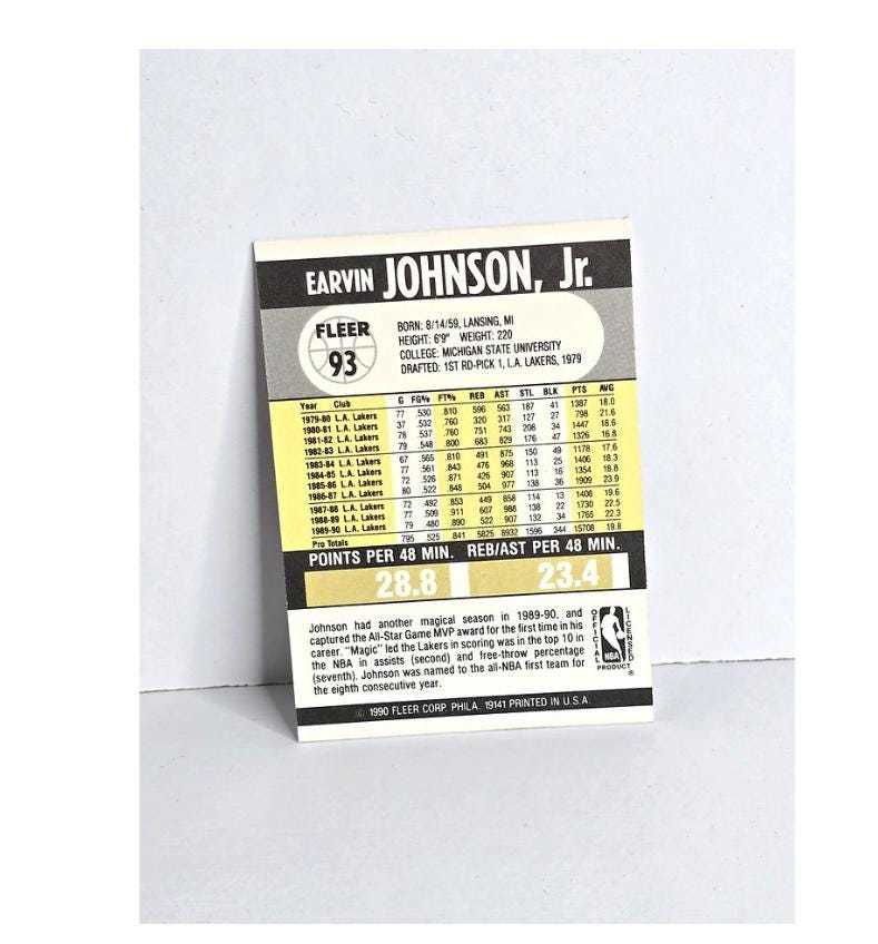 Earvin "Magic" Johnson Basketball Card 1990 Fleer No. 93 - Misprint Error Double Lines, Mint Condition See Photos - Includes FREE SHIPPING. Note sports memorabilia market hit $16 billion in 2023. Projections indicate it will reach $52 billion by 2032, with a compound annual growth rate (CAGR) of nearly 14% during the forecast period (2024-2032).