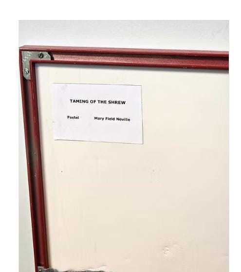 Taming of the Shrew Painting Signed by Artist M. Neville (1932-2024) ... Interesting art piece, intriguing subject in Excellent Condition, framed See Photos - Measures 28" W x 34 1/2 " H ... INCLUDES FREE SHIPPING ... Original 100% hand painted, artist signed painting. Note market on-average for fine art 6.5% annual return rate, projected to hit $115 billion by 2032.