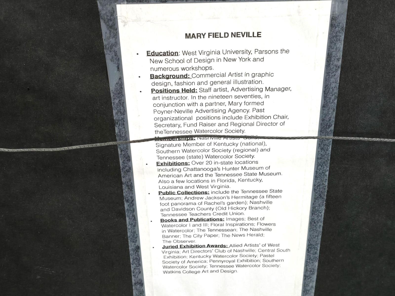 Artist, Neville is a native of W. Virginia, was educated at W. Virginia University and School of Design. Neville worked as a commercial artist in graphic design, fashion and general illustration; she has held positions as advertising manager and art instructor giving workshops and teaching privately. Artist exhibited widely in solo and juried exhibitions on local, state, regional and national levels receiving numerous awards. She is an artist / signature member of the Tennessee, Kentucky and Southern Watercolor Societies. Her paintings of primarily watercolor and oil are included in private and public collections including the Tennessee State Museum and historic venues such as Andrew Jackson’s Hermitage Museum. A selection of the artists work has been featured in four fine art books, two of which are Rockport Publishers ;The Best of Watercolor", among other prestiges accolades.