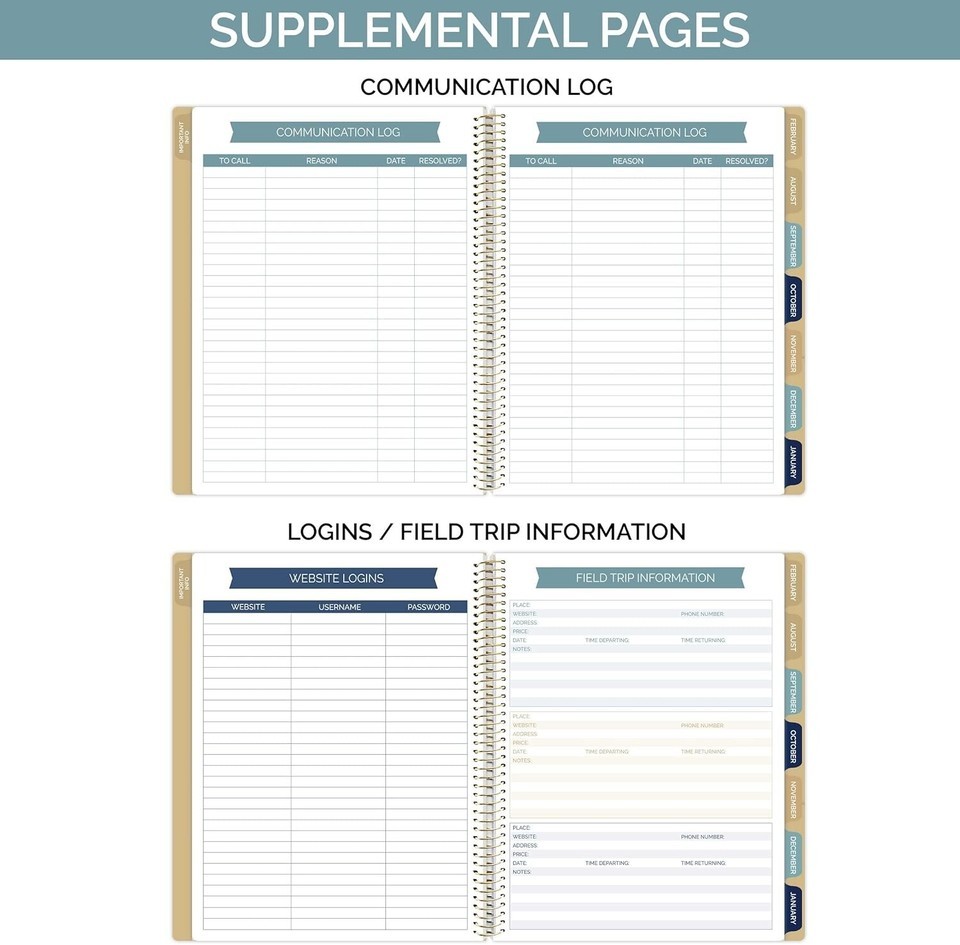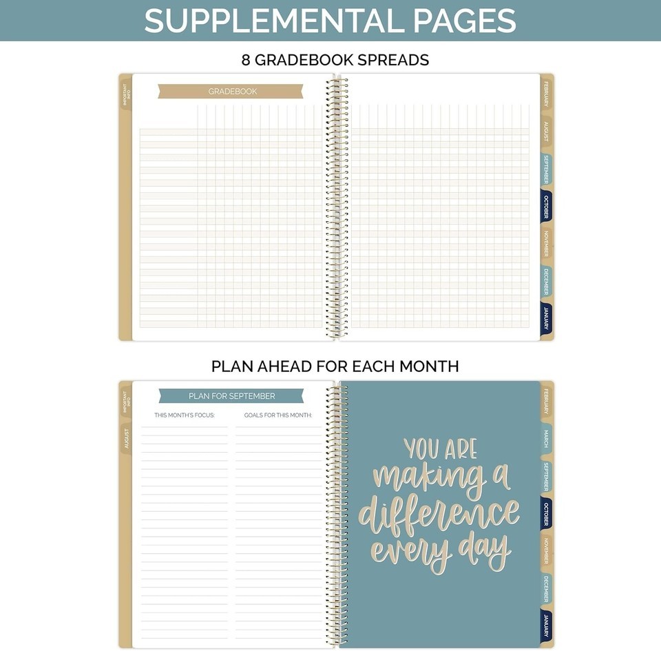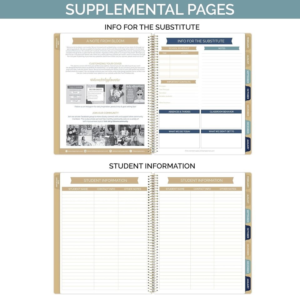Supplemental Pages: Includes personal info page, "Info for the Sub" page, student information, contact logs, website login page, field trip planning page, graph paper, gradebook spreads, important dates, and birthday tracking.