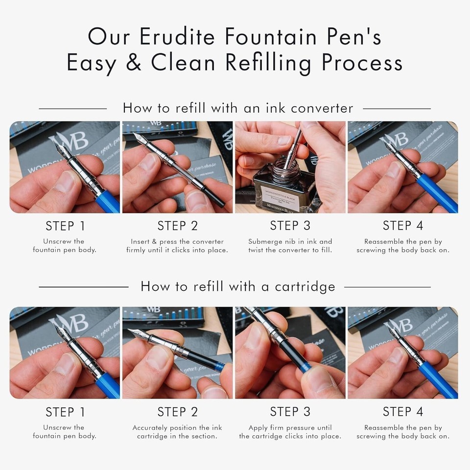 ??Discover The All-inclusive Refillable Fountain Pen Set - Each set includes a luxurious fountain pen, ink converter, 24 pack of ink cartridges, and a beautifully presented gift pouch, ideal for gifting. Each ink cartridge is packaged in a re-closable case, providing up to two weeks of regular use. With each purchase, you?ll receive an instruction booklet to help you maximize the enjoyment of this luxurious writing tool.