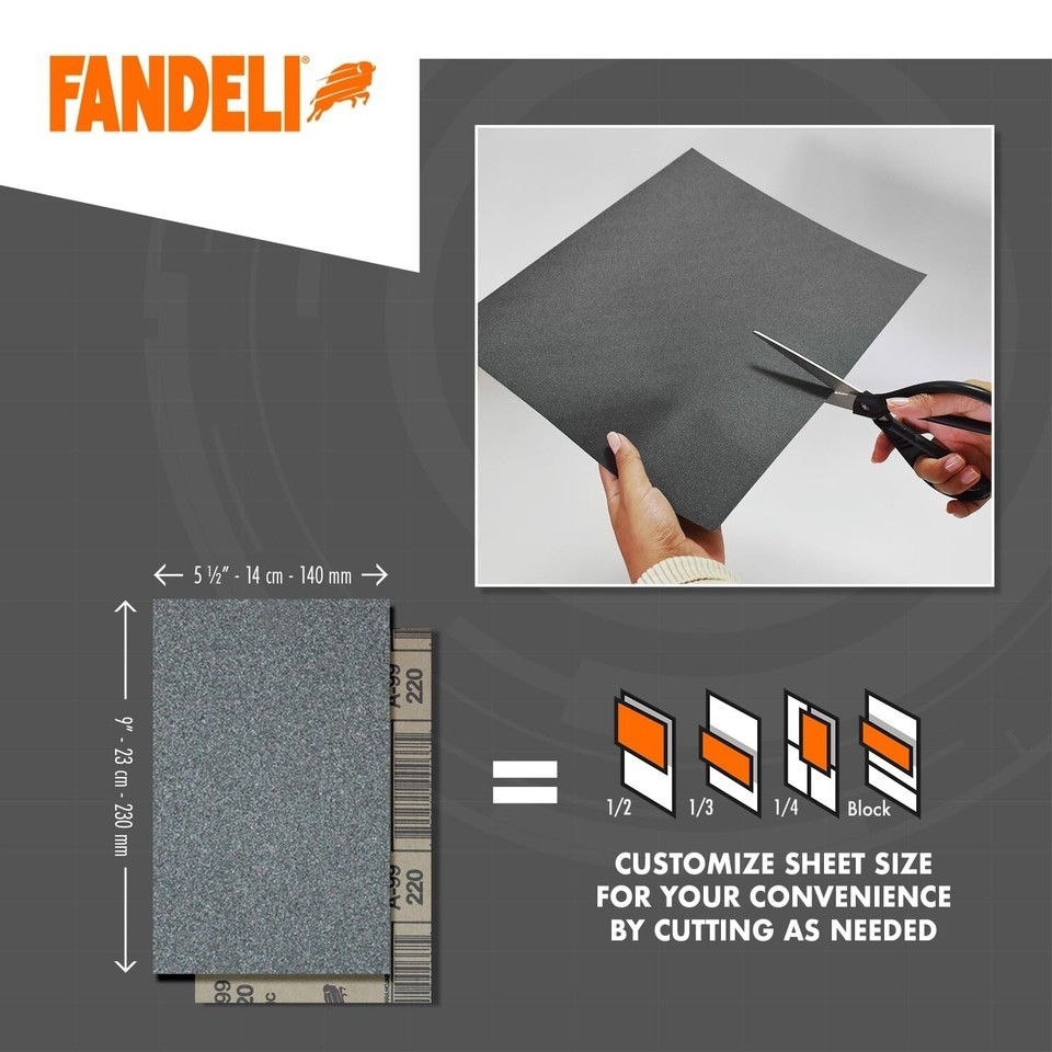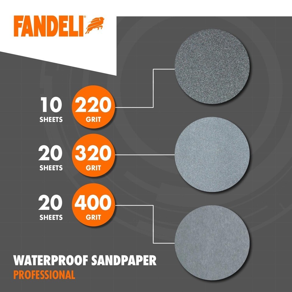 - Includes 50 sheets of assorted grits: 220 (5 sheets), 320 (10 sheets), 400 (10 sheets)