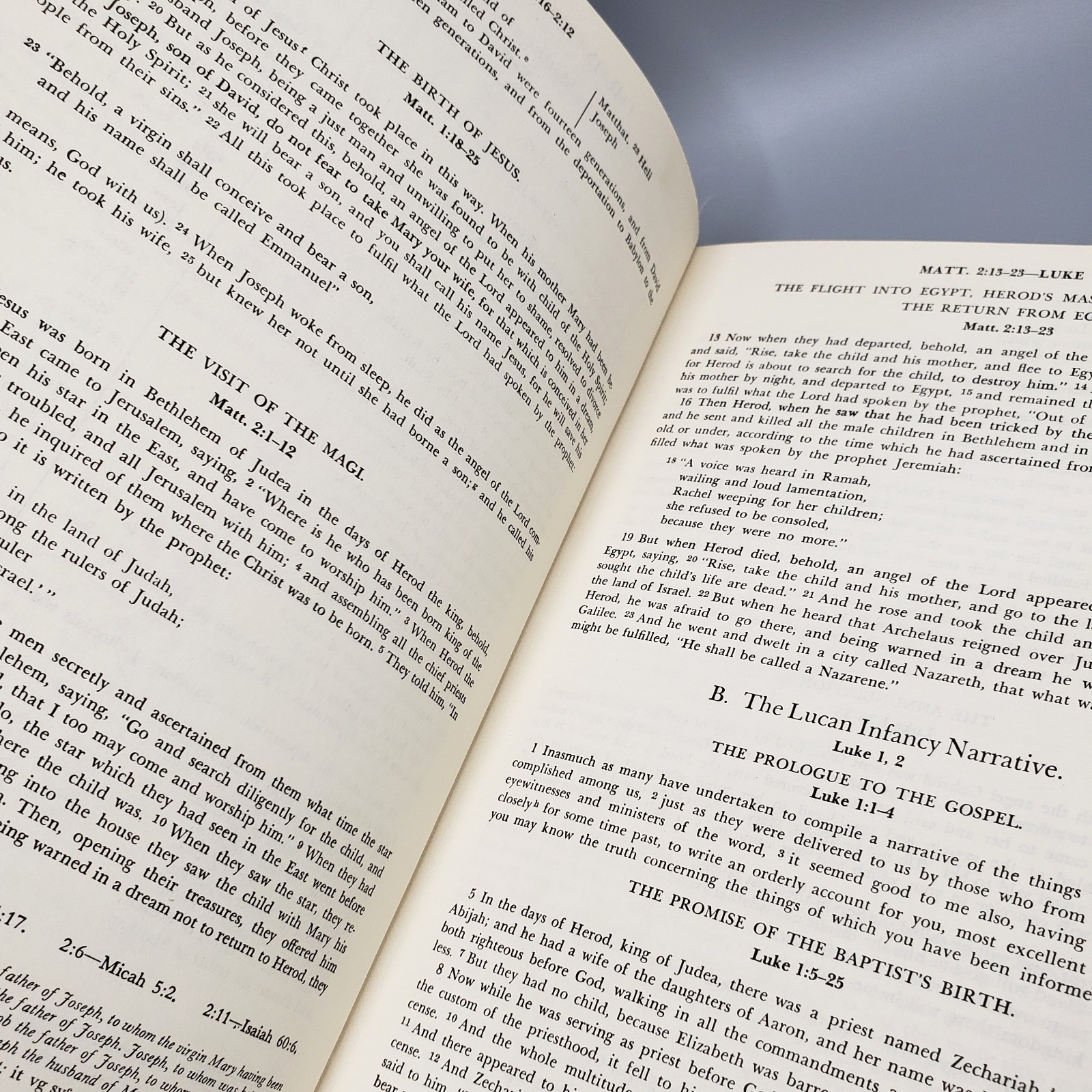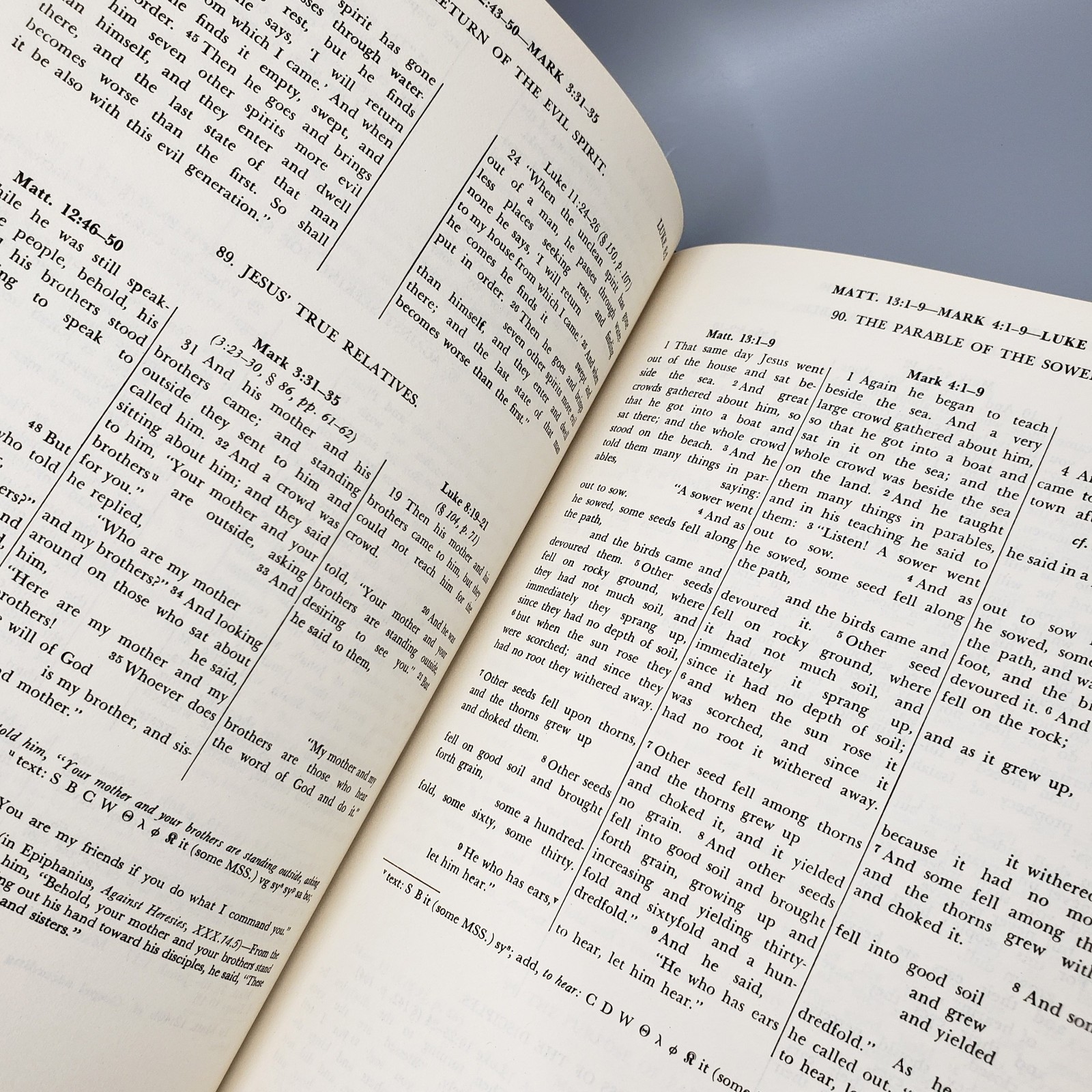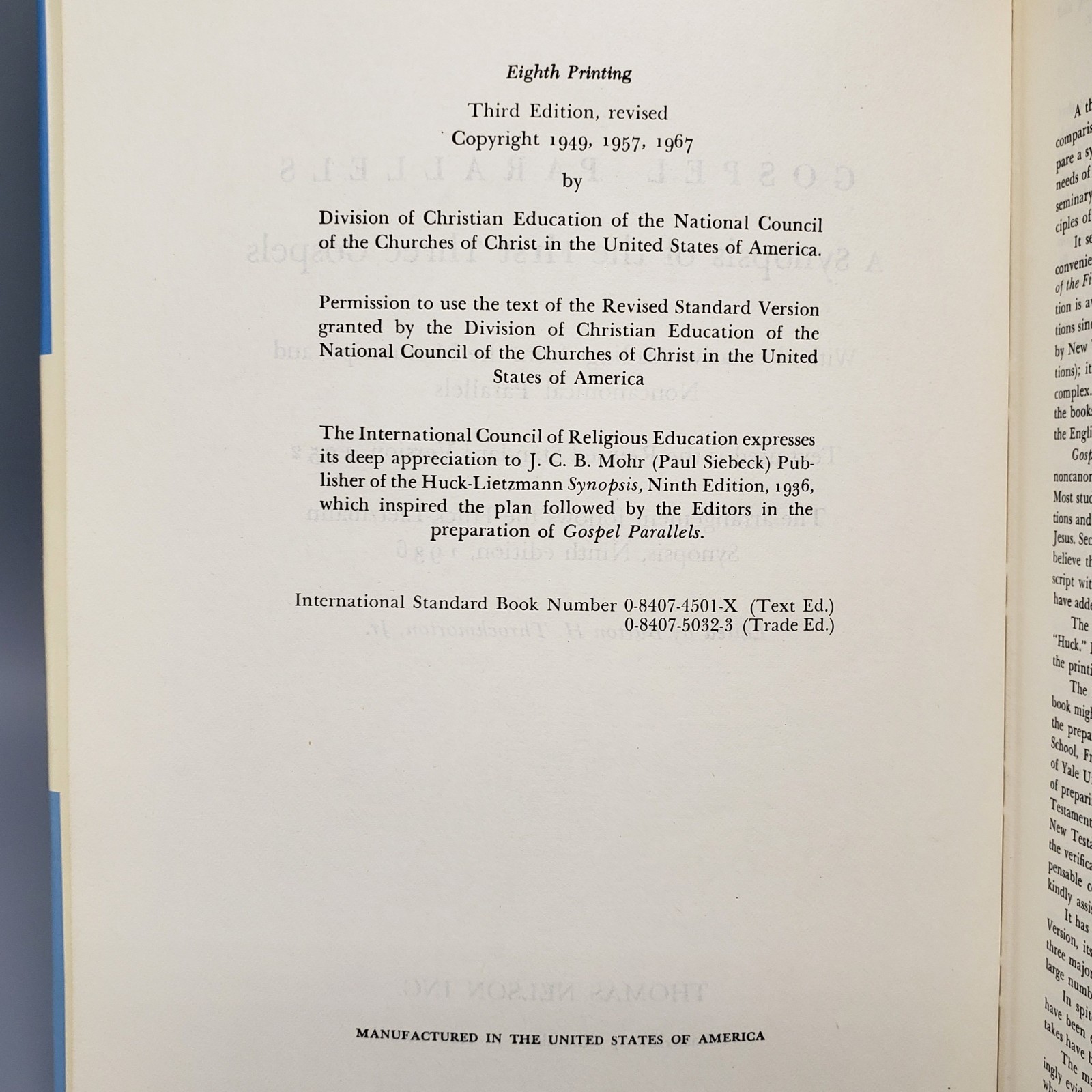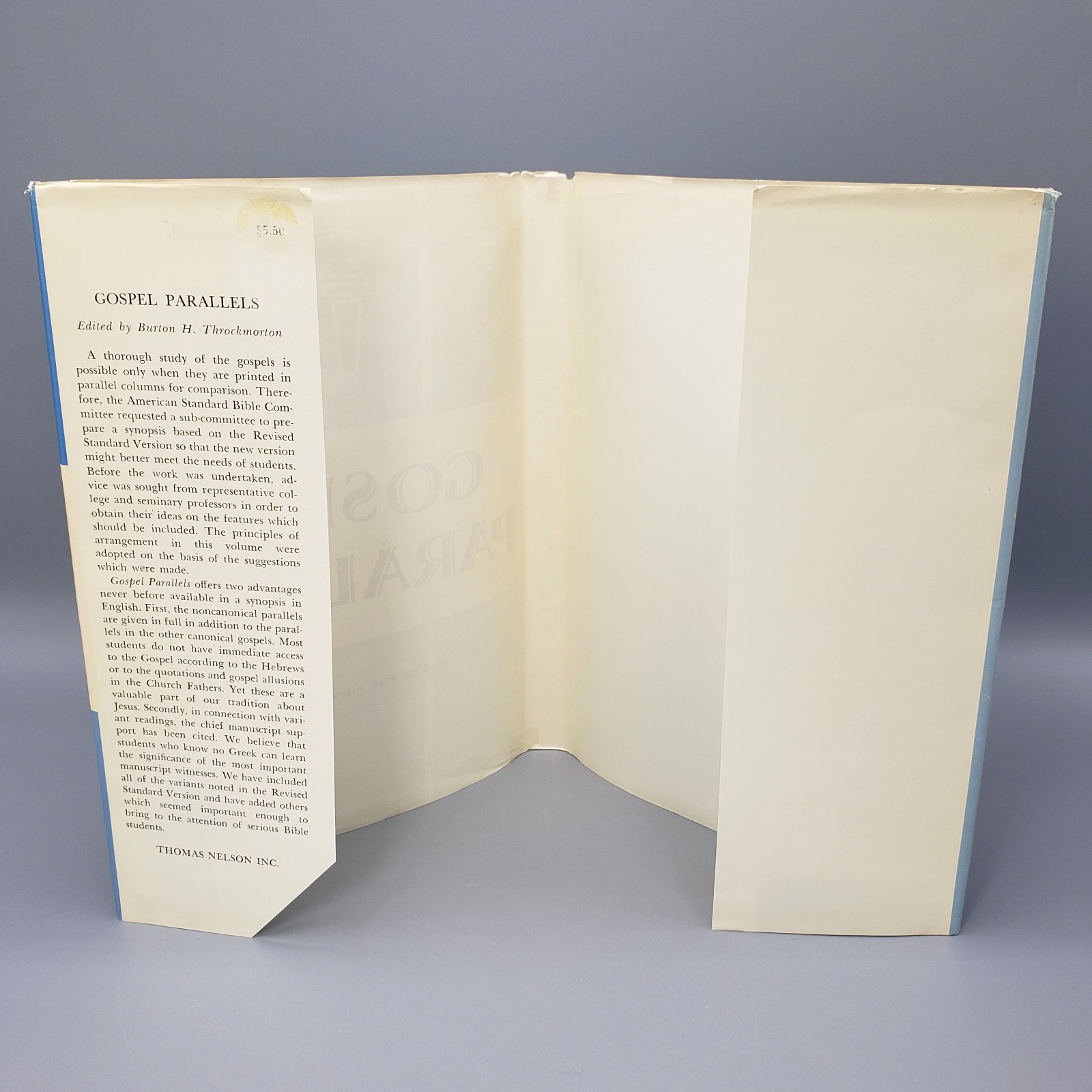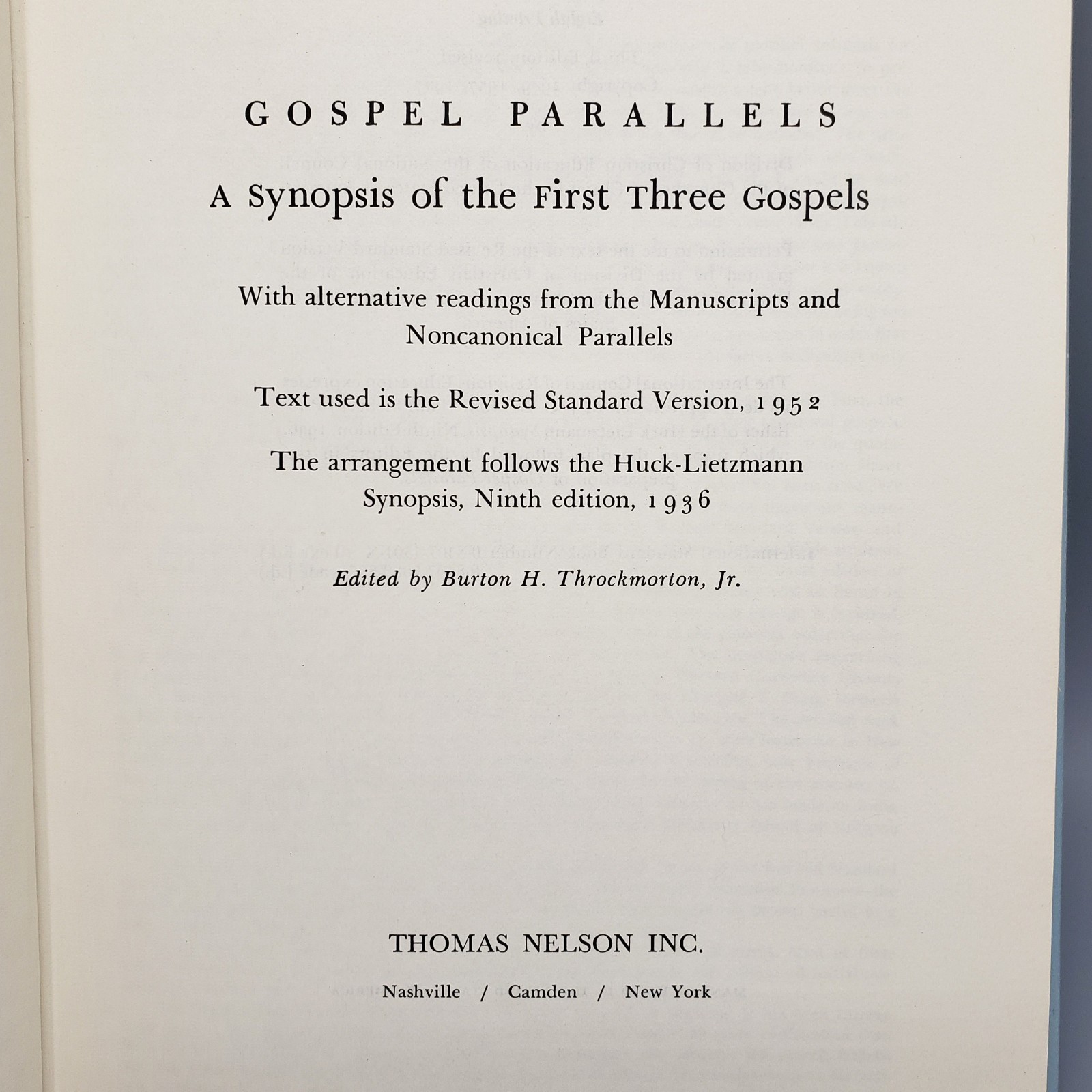 Vintage 1967 edition of Gospel Parallels: A Synopsis of the First Three Gospels. This hardcover book is an 8th printing of the 3rd edition. It was edited by Burton H. Throckmorton and published by Thomas Nelson Inc. The book measures approximately 10-1/4" tall, 7-3/4" wide, 7/8" thick.