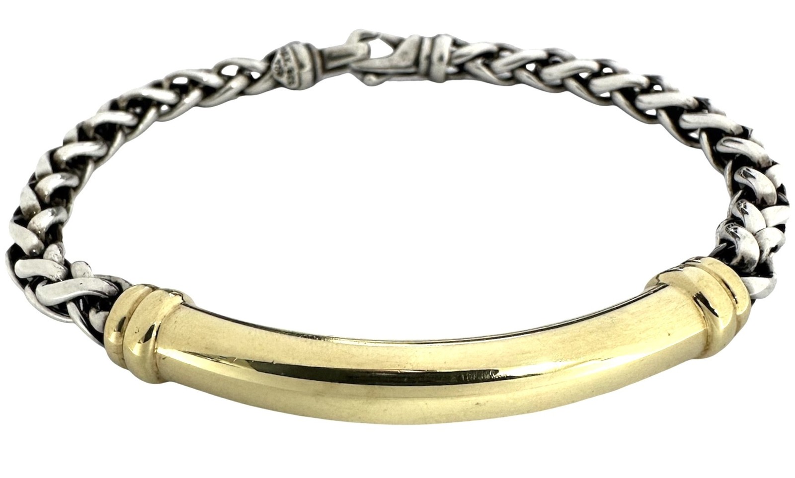 Type: BraceletWeight: 19.9Karat: .925Metal: Silver and GoldGender: Men'sStyle: WheatBrand: David YurmanSize / Length: 8.5Owner applied: D.Y. 925750Thickness: 6mmCondition:Used
