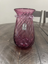 Vintage Pilgrim Glass Small Vase Optic Swirl Cranberry Ruffled Top Sticker 7”