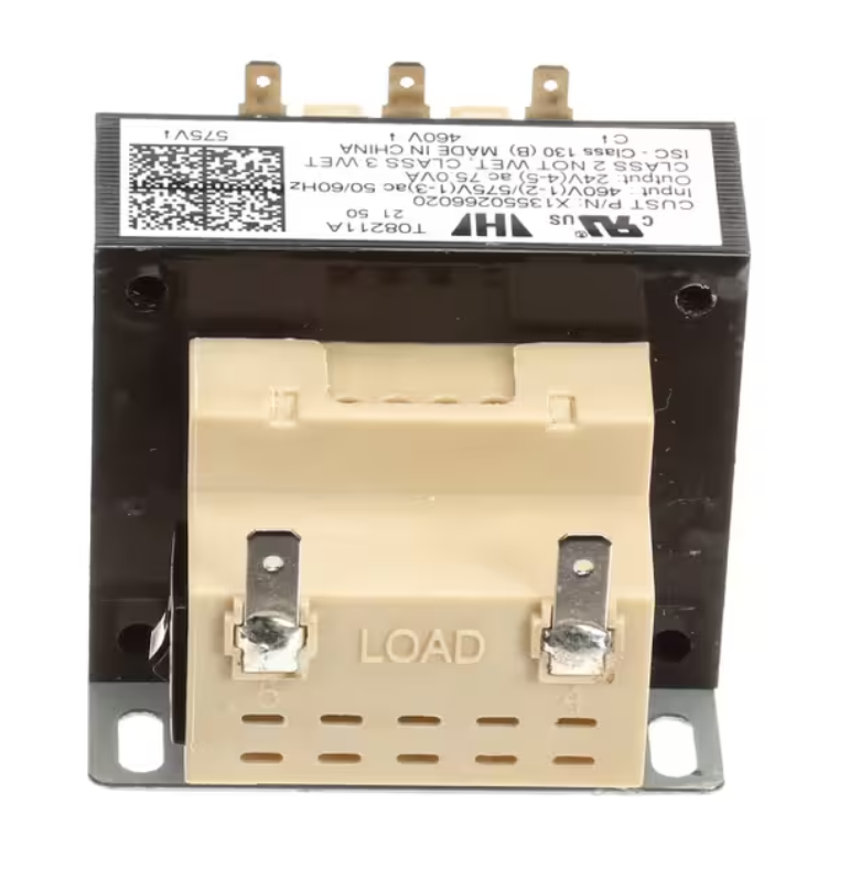 The Trane T08211A Transformer (also known by part numbers TRR00826 and X13550266020) is a reliable low-voltage power supply component designed for commercial HVAC systems. It efficiently steps down 460?575V input to 24V output, supporting critical 24V control circuits in heating and cooling equipment. Its 75VA capacity ensures dependable operation across a wide voltage range and multiple compatible models.