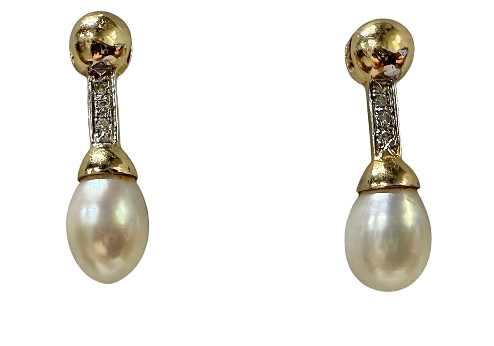 Type: EarringsWeight: 2.6Karat: 14ktMetal: Yellow GoldGender: Women'sStyle: DangleSize / Length: PairOwner applied: 14kStone 1 quantity: 1Stone 1 shape: OtherStone 1 color: WhiteStone 2 Quantity: 6Stone 2 Shape: RoundStone 2 Color: ClearStone 1 type: PearlStone 2 Weight (Total): .06Condition:Used