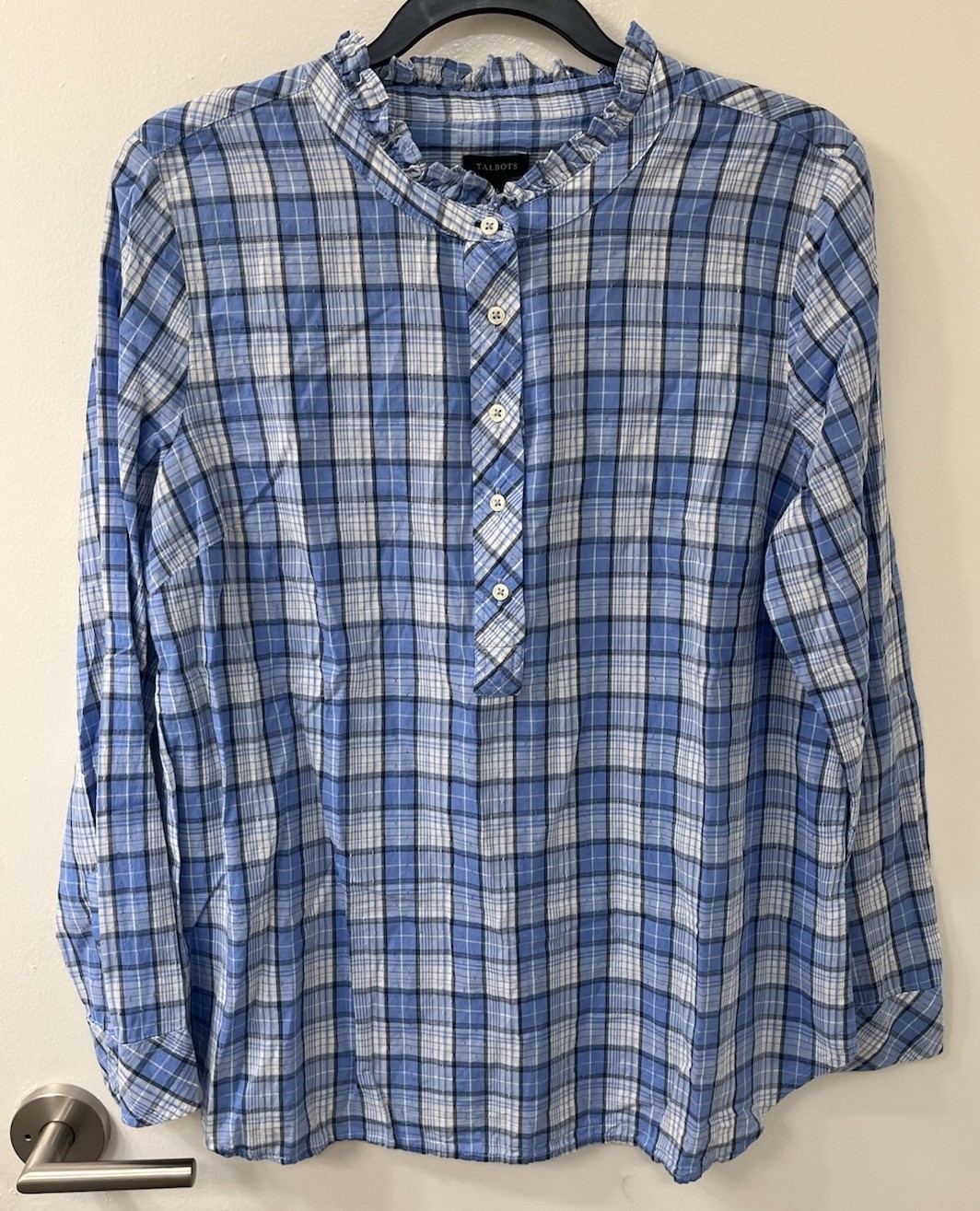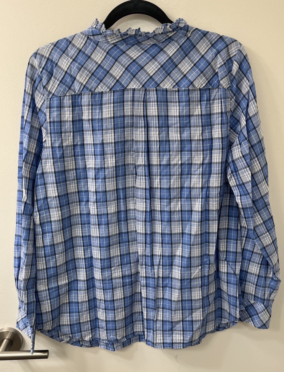 Talbots Women's Size L Blue White Plaid Long Sleeve Ruffle Collar Top Shirt