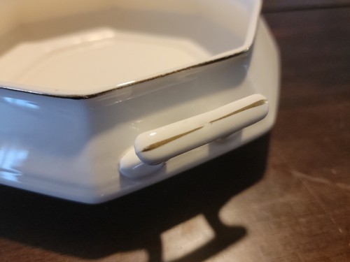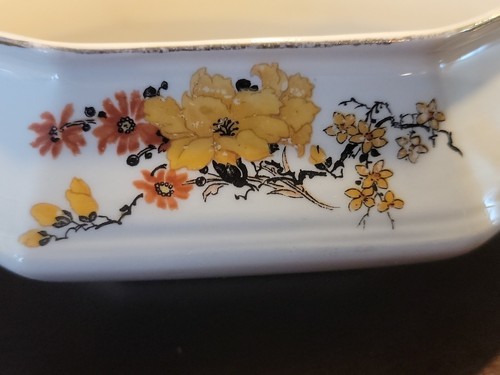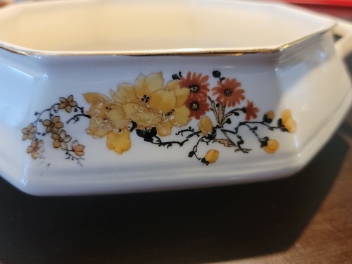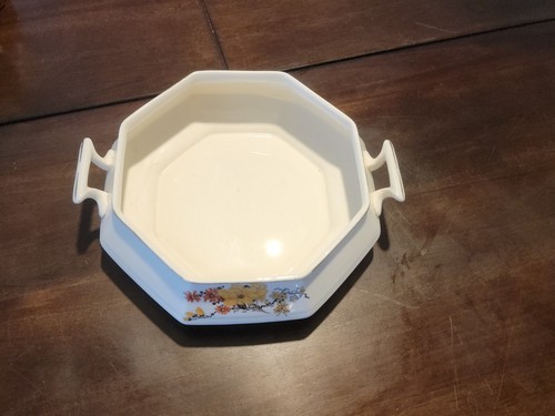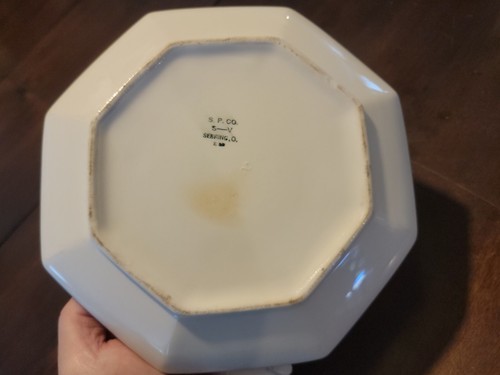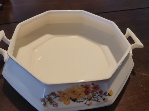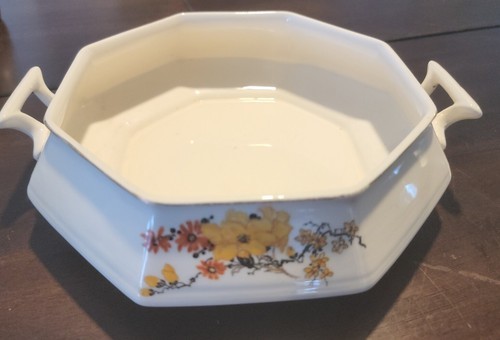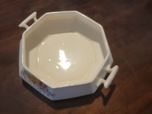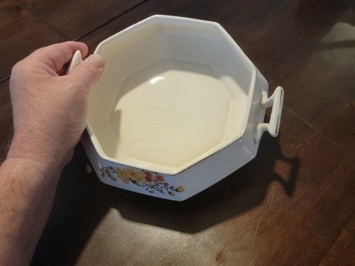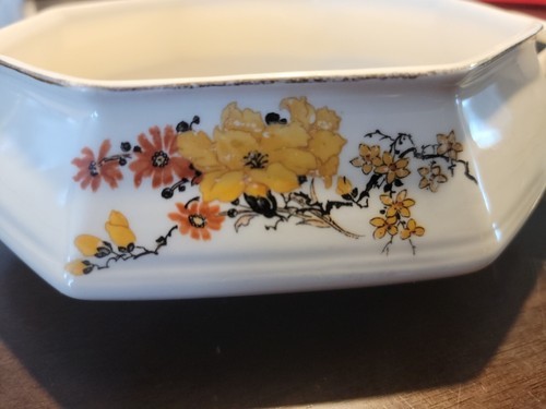 S. P. Co S----V Sebring , O Covered Casserole Dish Serving Gold Trim.Nice Co dition,has some Gold rubbed off on edges and missing top,colors are bright.see pics.octogonal shape.