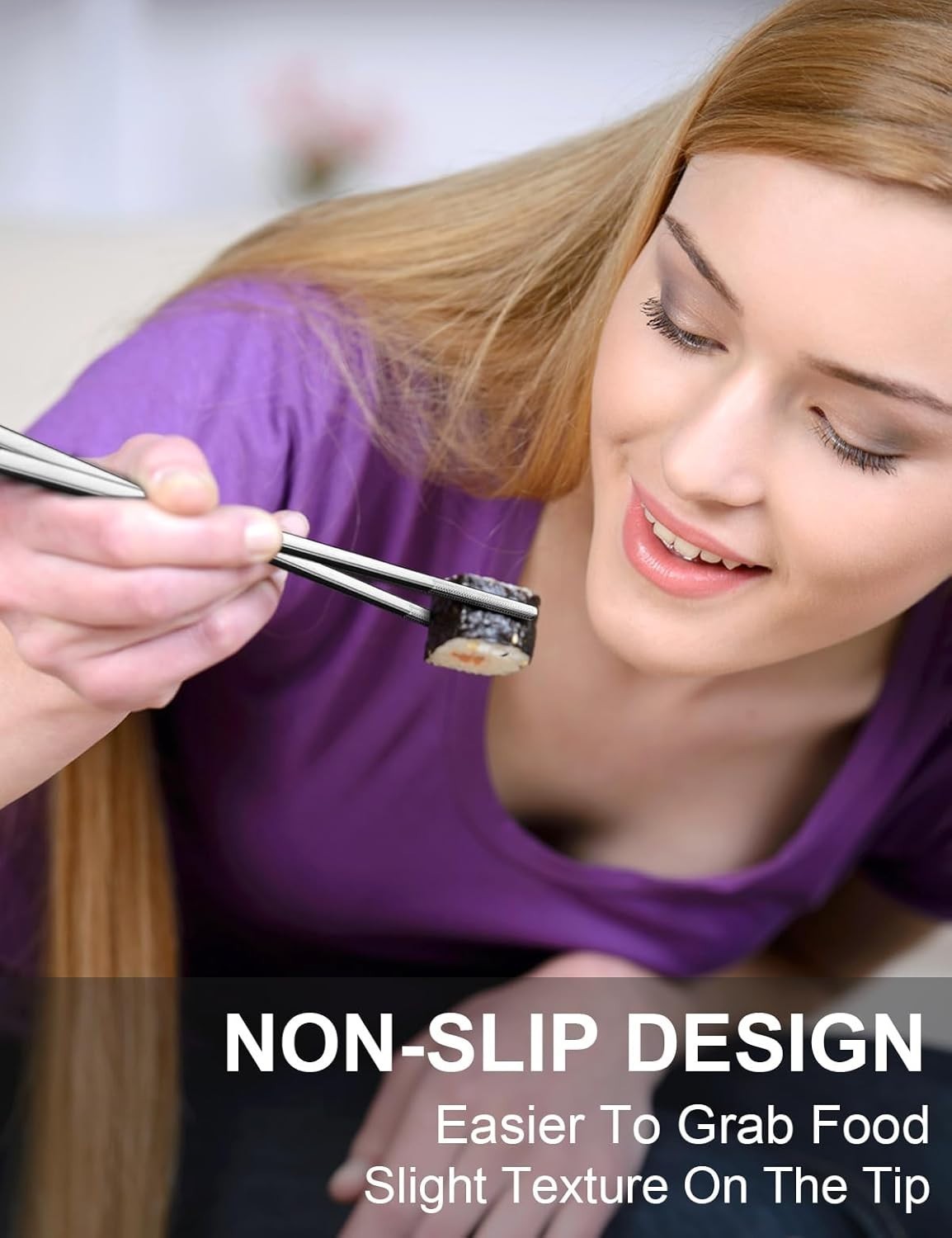 Elevate your dining experience with our modern-style, laser-engraved metal chopsticks. Crafted from high-quality food-grade 304 stainless steel, these reusable chopsticks boast vibrant patterns that won?t fade over time, unlike cheaper alternatives. Designed with anti-slip tips and a comfortable, lightweight square shape, they provide a secure grip and ease of use for both beginners and seasoned users. Dishwasher safe and easy to clean by hand, these durable chopsticks are as practical as they are stylish. Perfect as a sophisticated gift for holidays, birthdays, or special occasions, each set includes five elegant pairs.