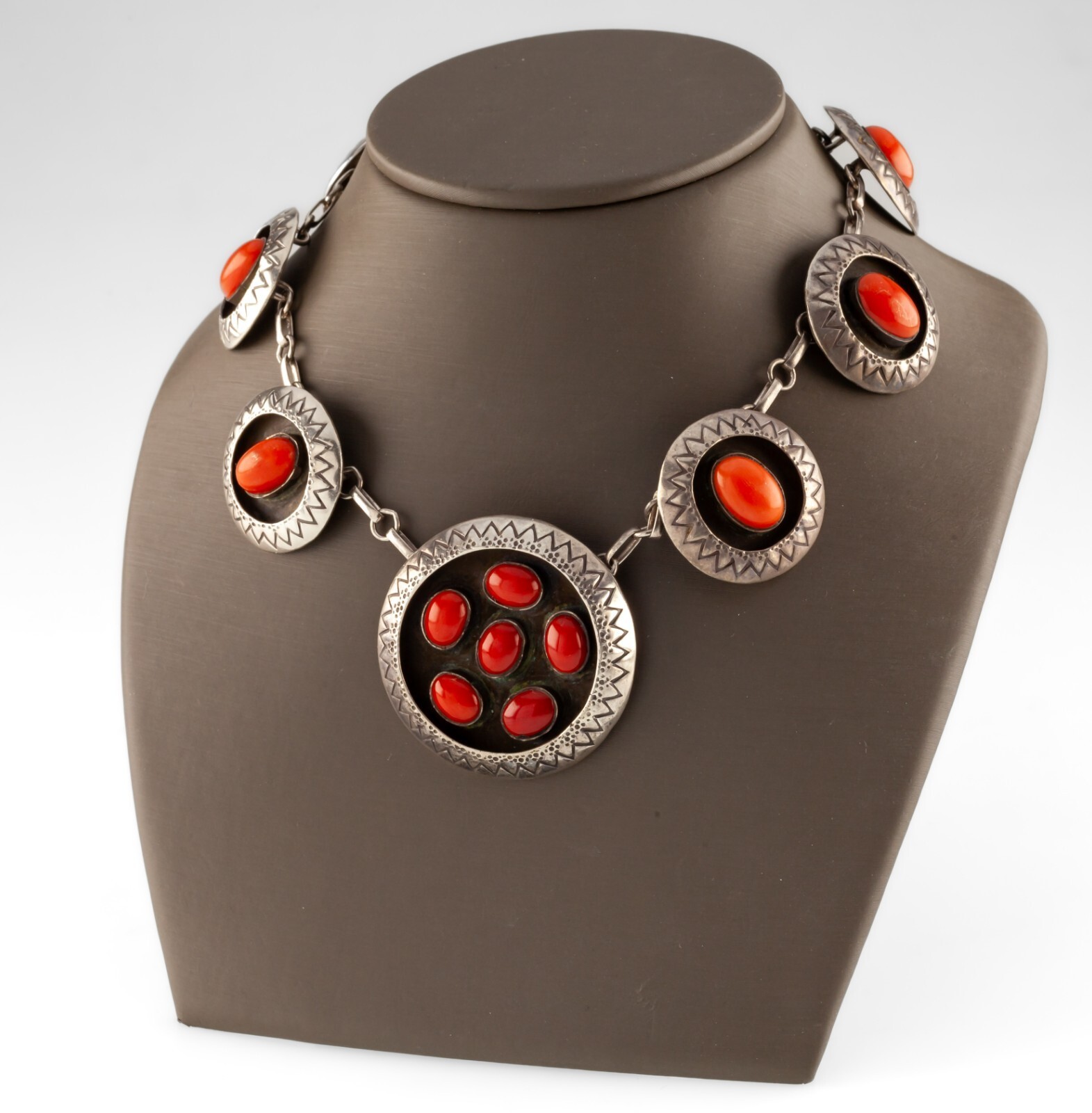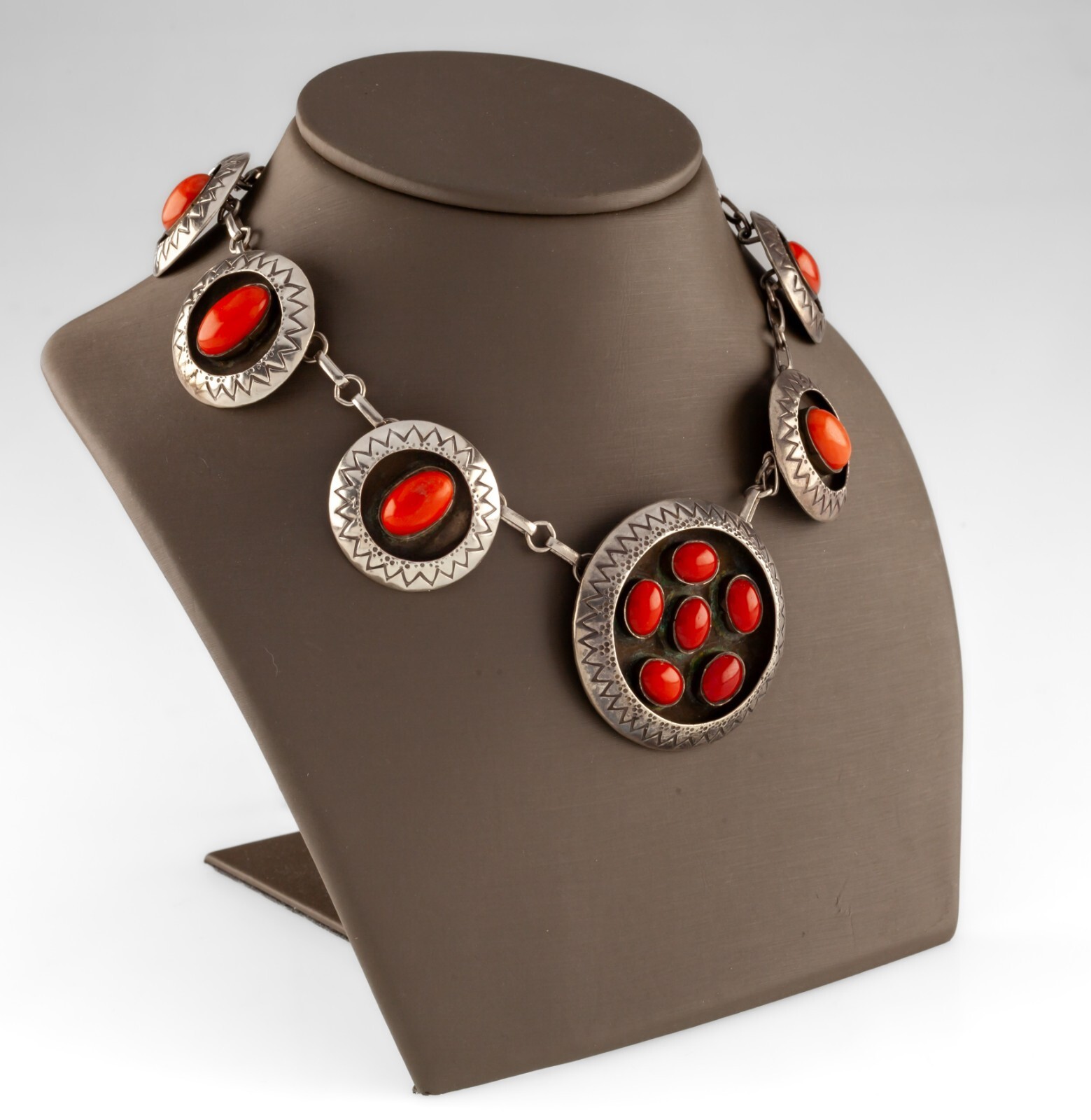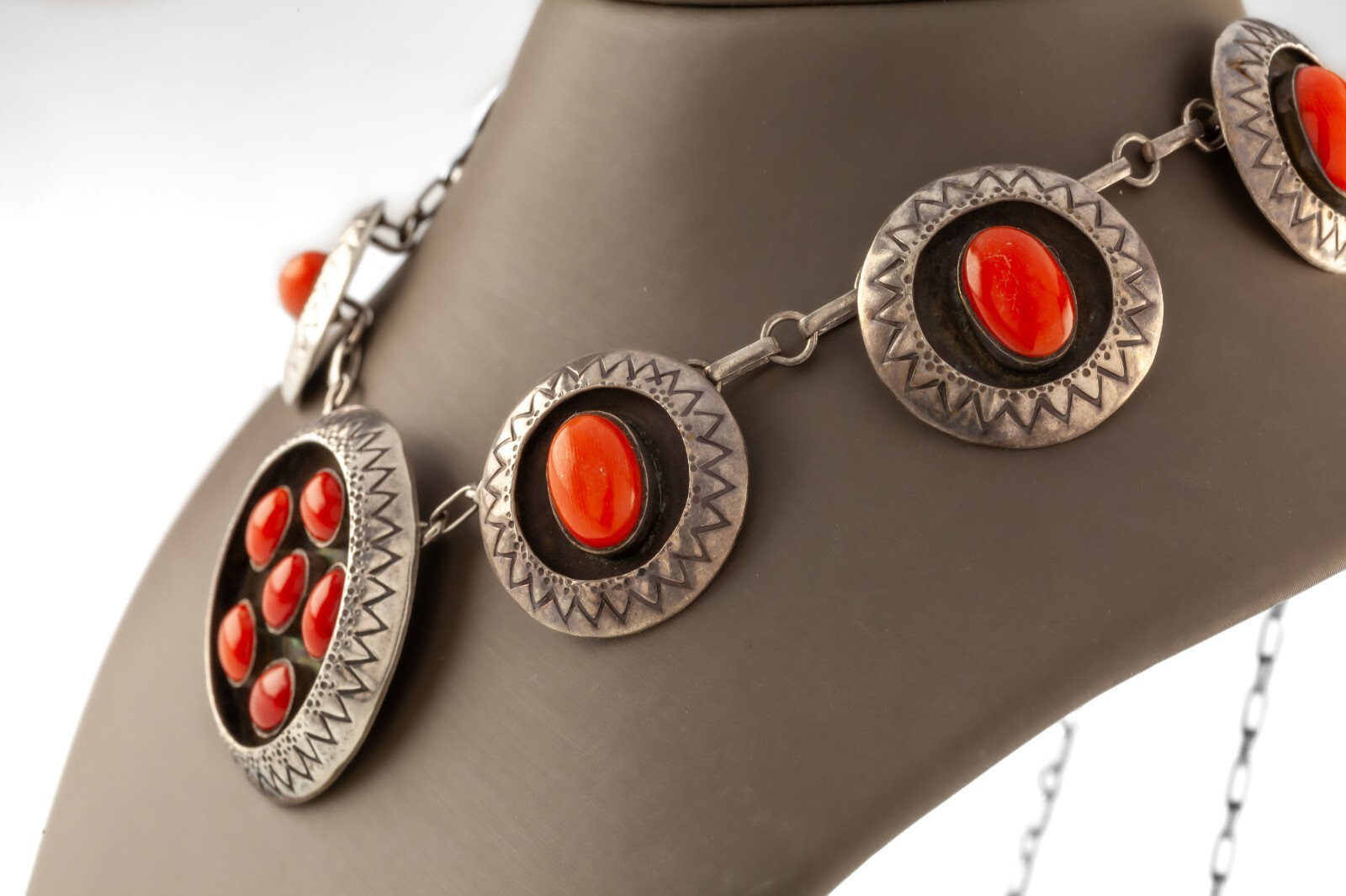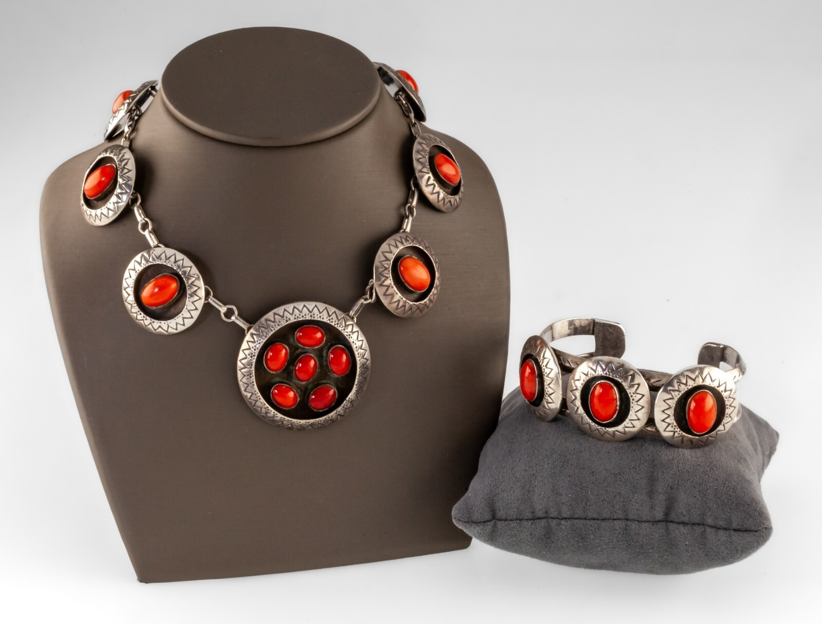 Navajo Sterling Silver Coral Shadowbox Necklace & Cuff Bracelet Set 85g