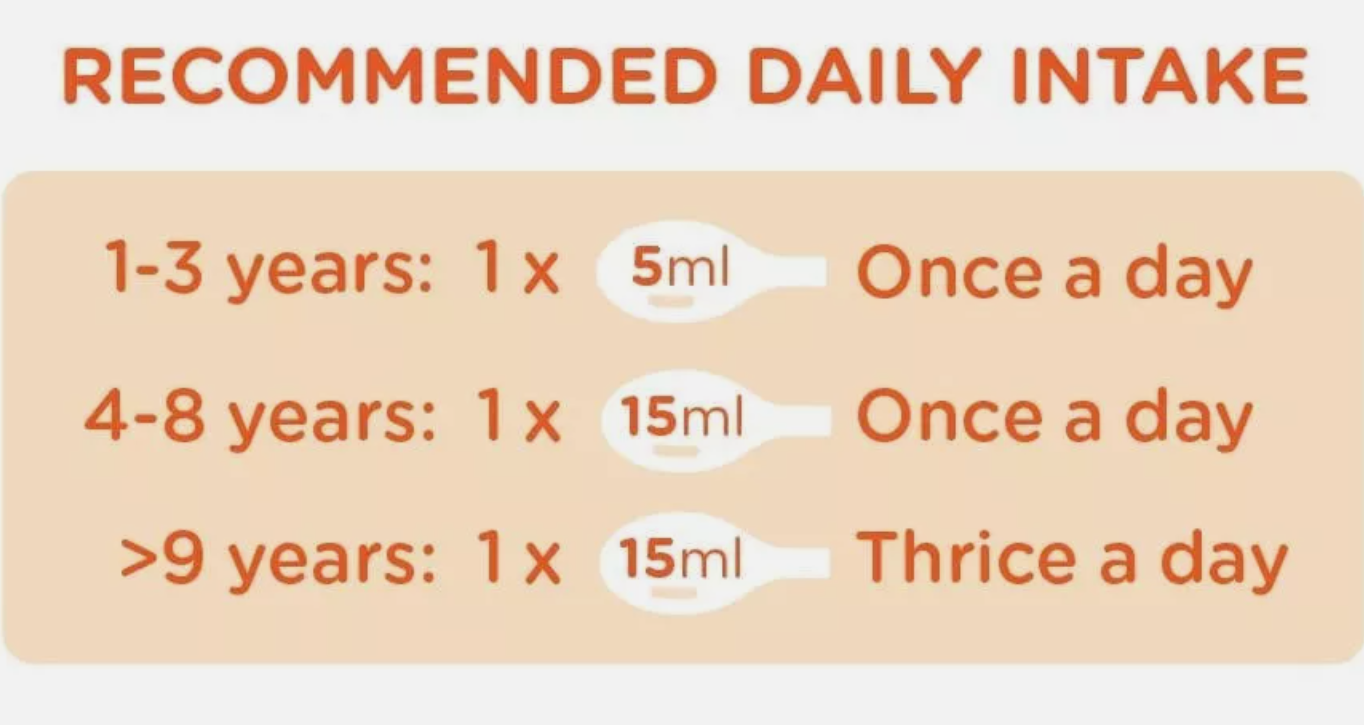 1) Children 1-6 years: One (15ml) tablespoonful once a day.