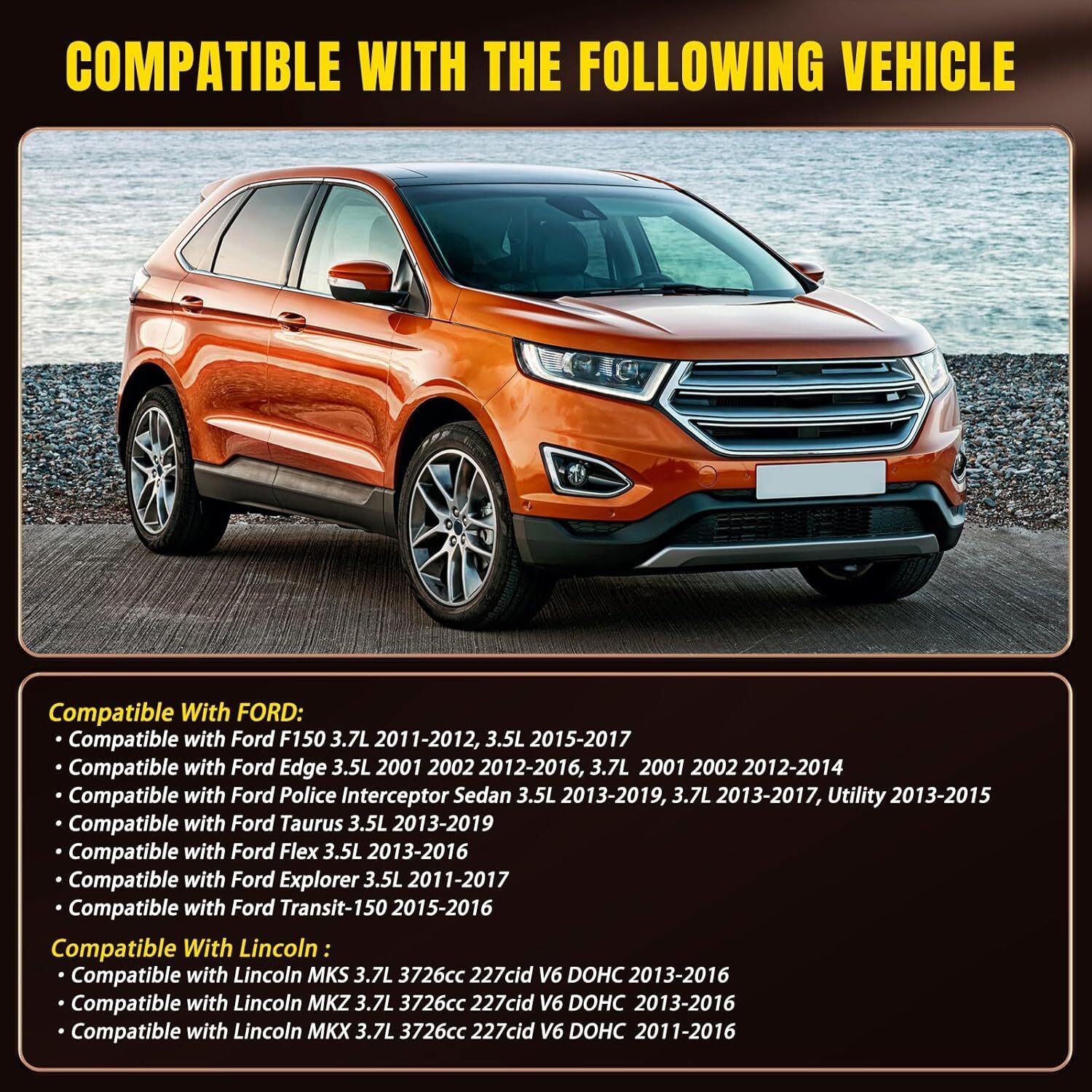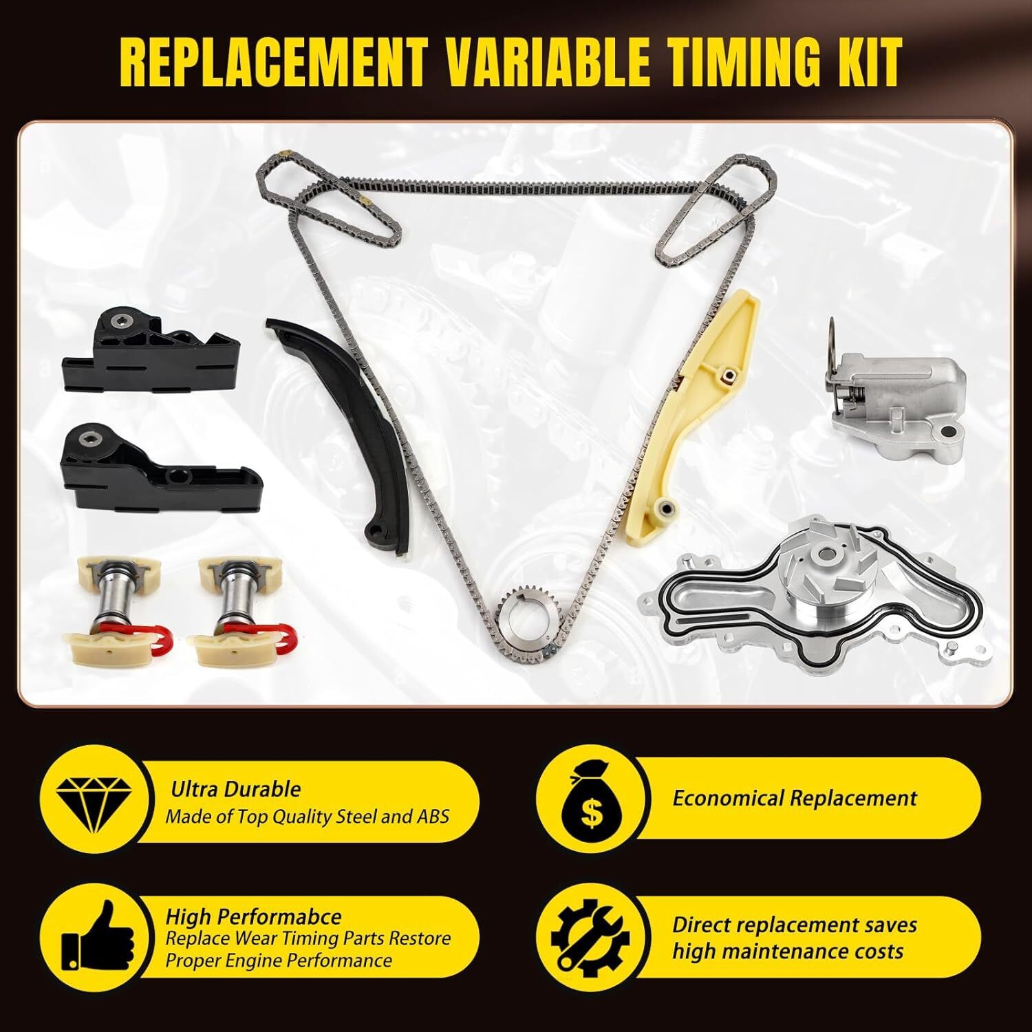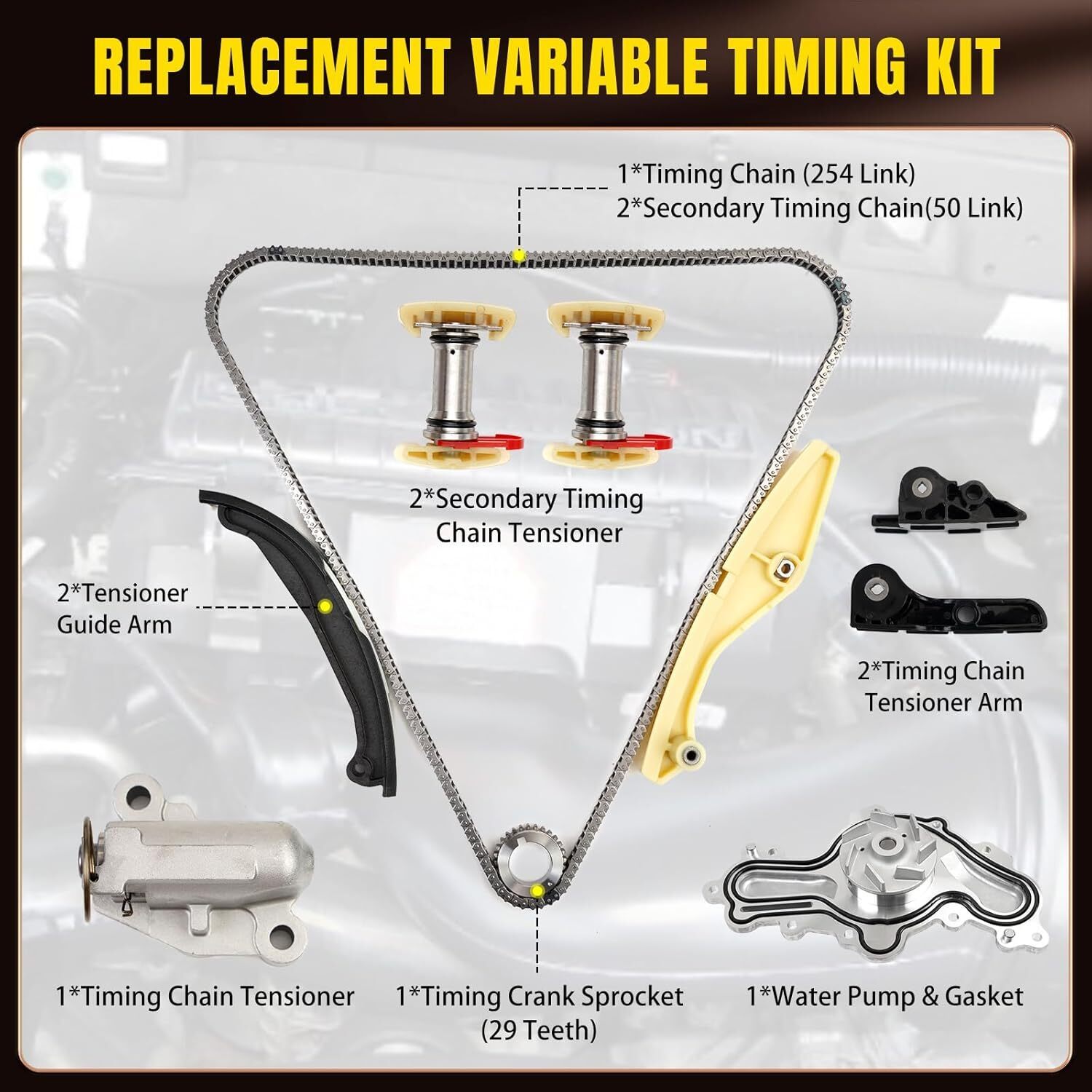 ?Compatible With?Engine Timing Chain Kit compatible with Ford F150 3.7L 2011-2012, 3.5L 2015-2017,compatible with Ford Edge 3.5L 2001 2002 2012-2016, 3.7L 2001 2002 2012-2014,compatible with Ford Police Interceptor Sedan 3.5L 2013-2019, 3.7L 2013-2017, Utility 2013-2015,compatible with Ford Taurus 3.5L 2013-2019, compatible with Ford Flex 3.5L 2013-2016, compatible with Ford Explorer 3.5L 2011-2017, compatible with Ford Transit-150 2015-2016, compatible with Lincoln MKS MKZ MKX 3.7L 2011-2016. ?Replacement OE Number?Our Timing Chain Set replacement for BL3Z-6268-A BL3Z6268A AT4Z-6268-A AT4Z6268A AT4Z-6306-A AT4Z6306A JL3Z-6L266-A JL3Z6L266A AT4Z-6K254-A AT4Z6K254A AT4Z-6B274-A AT4Z6B274A BL3Z-6K255-A BL3Z6K255A AT4Z-6K297-A AT4Z6K297A AT4Z-6K297-B AT4Z6K297B AT4Z-6K297-D AT4Z6K297D 125-3340 1253340 AW6348. ?High-Quality?Our premium-grade Engine Timing Chain made of high-quality steel and wear-resistant alloys, ensures dependable power transfer and long-lasting performance. The precision-engineered Guide Rail guarantees smooth, quiet chain operation while minimizing wear and tear. ?Package Contents?Our Engine Timing Chain Kit includes primary oil pump chains, right left guide rail, timing chain tensioner, gear, and water pump. ?Service?BHB is well aware of the importance of quality to consumers. We will check every product before shipment. If you have any problem, please get in touch with us and our team will solve it for you within 24 hours.