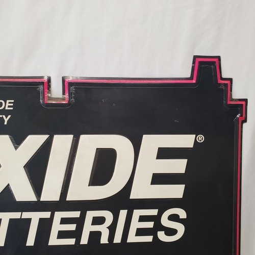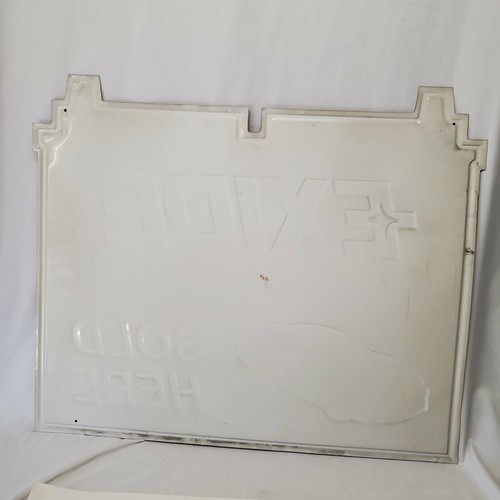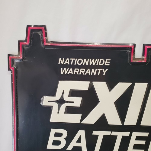 This is a super cool large Exide Batteries sign. It measures approx 35" x 29" and is embossed. It still has the original plastic coating on it. Its a little dusty but once that plastic comes off it'll look good. See pics.