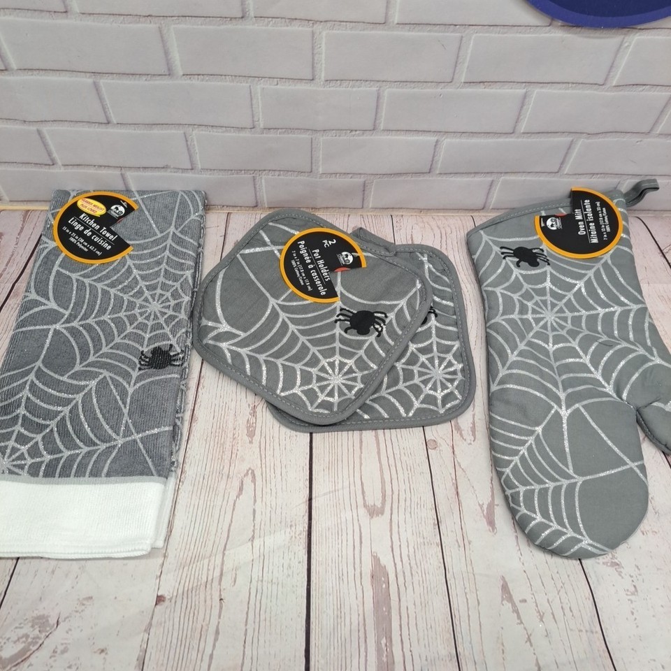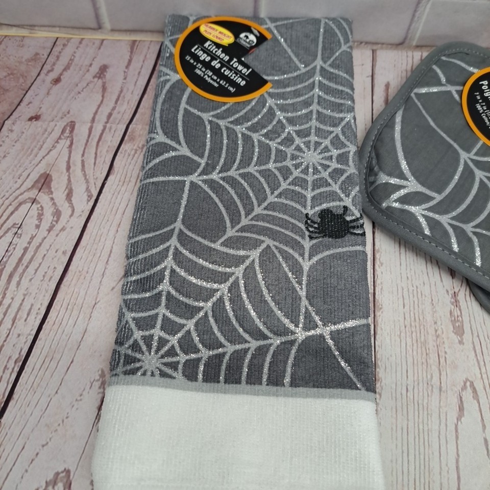 Halloween Glitter Spider Webs Kitchen 4pc Set - Towel, Pot Holders, Oven Mitt