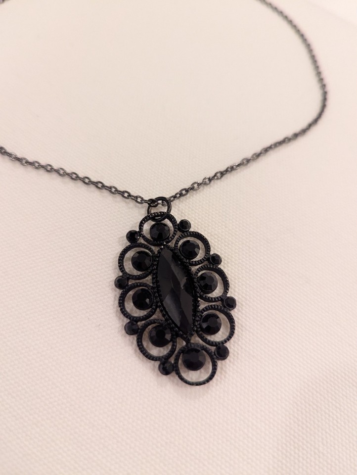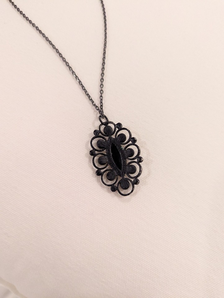 Stylish necklace with a black ornate pendant. Perfect for any occasion.