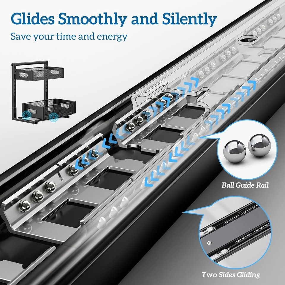 Smooth Silent Sliding: The under sink organizer comes with an easy - to - mount, full - extension ball - bearing bottom drawer. It glides in and out quietly and smoothly, even when fully loaded, just like slicing through warm butter. A perfect storage essential!