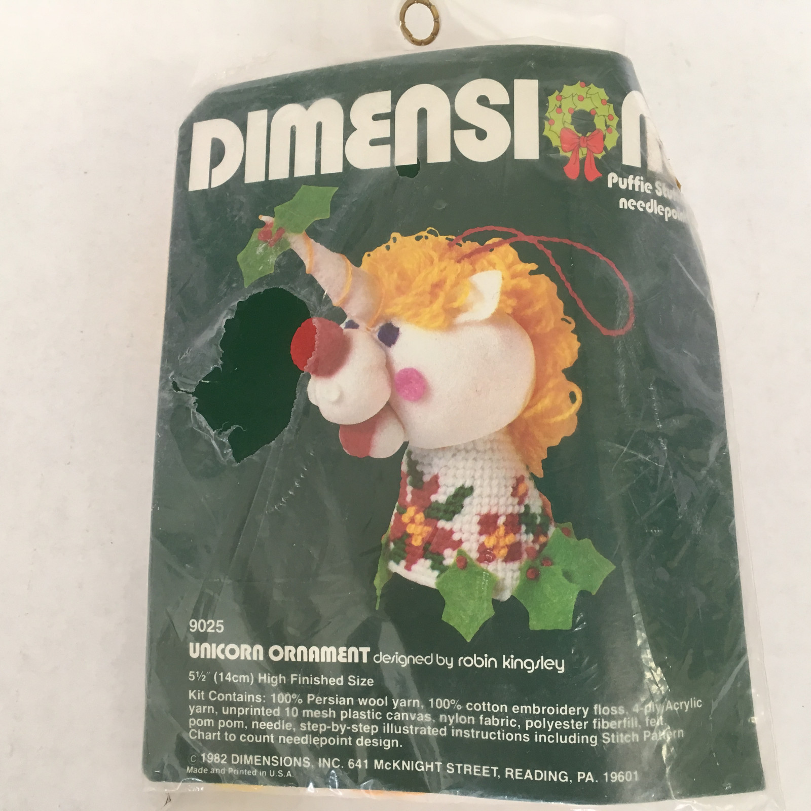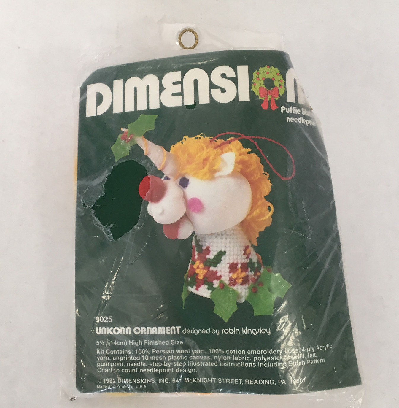 Vintage 1982 dimensions puffie stuffins needlepoint kit unicorn ornament holiday