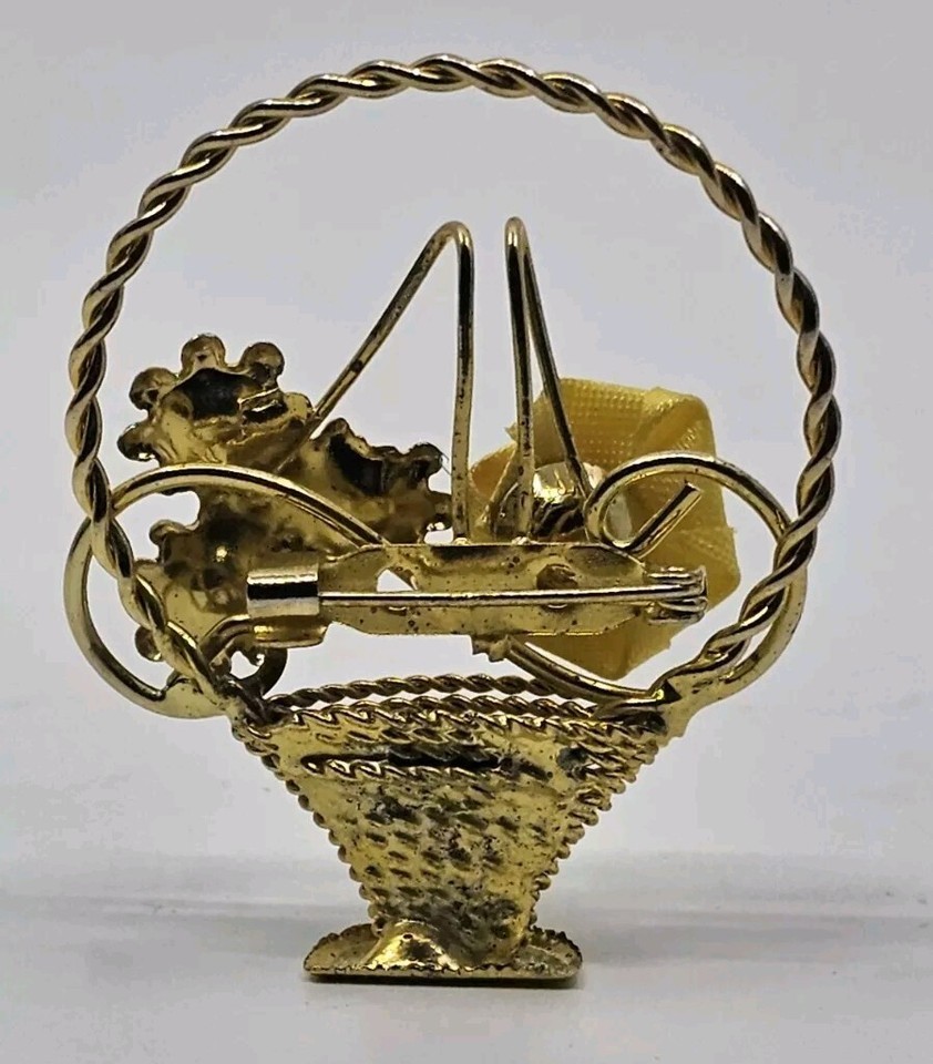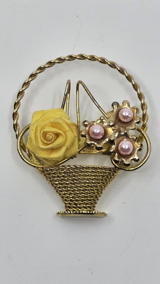 Vtg Gold Tone Faux Pink Pearl Yellow Rose Basket Flower Brooch Jewelry
