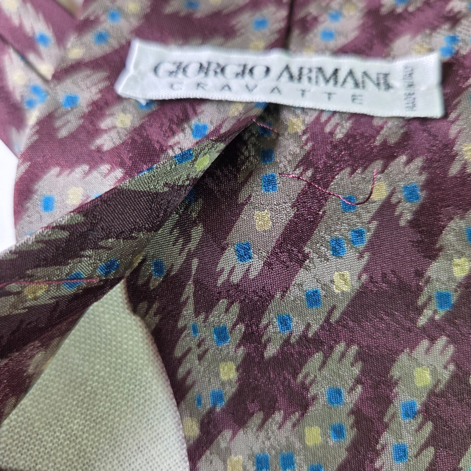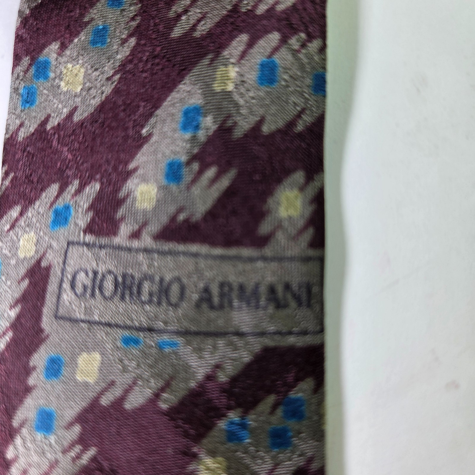 Giorgio Armani Cravatte tie made in Italy. 100% silk with a bold abstract geometric pattern in burgundy, gray, blue, and light yellow. Classic width and elegant style suitable for business or formal wear.