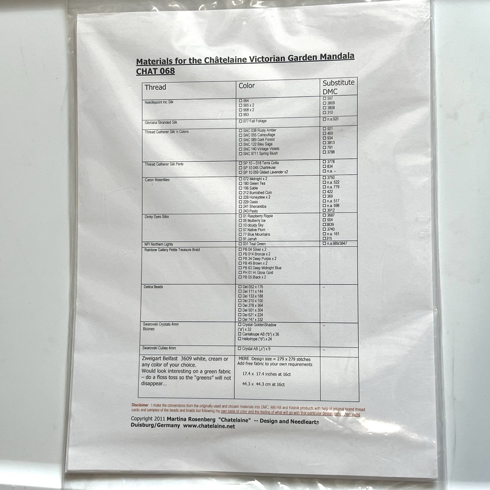 Includes Chart, Instructions and Material List - NO Threads, Beads or Fabric