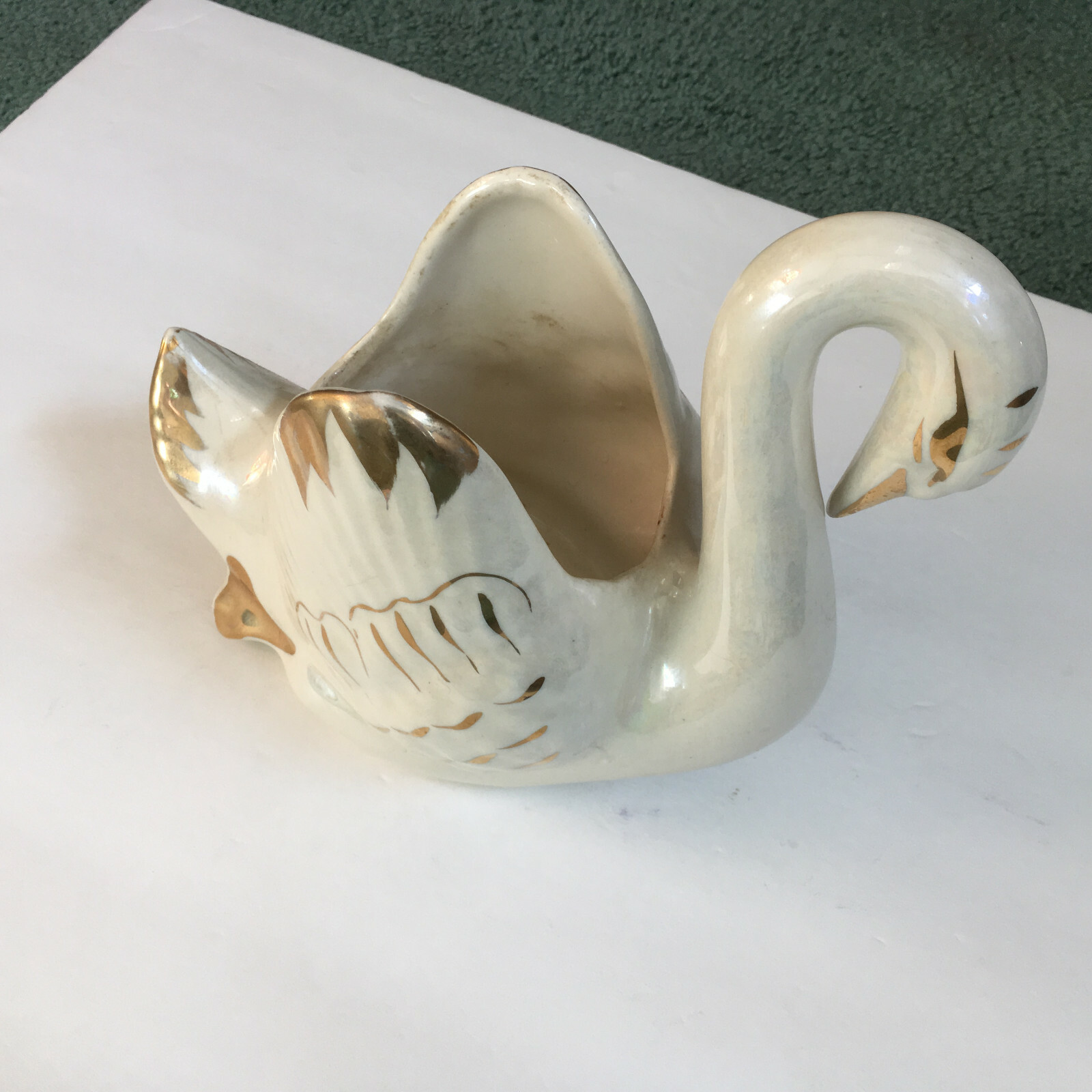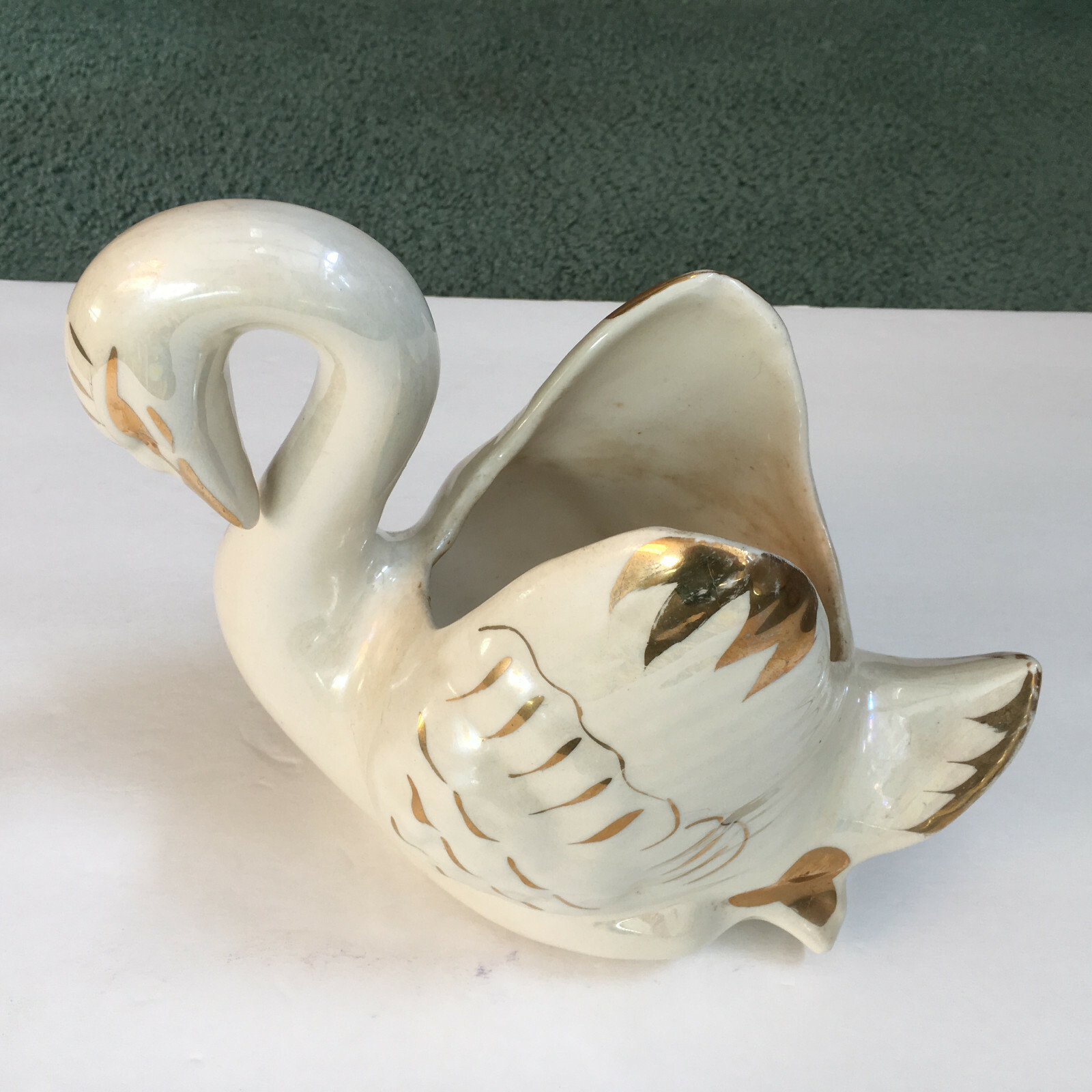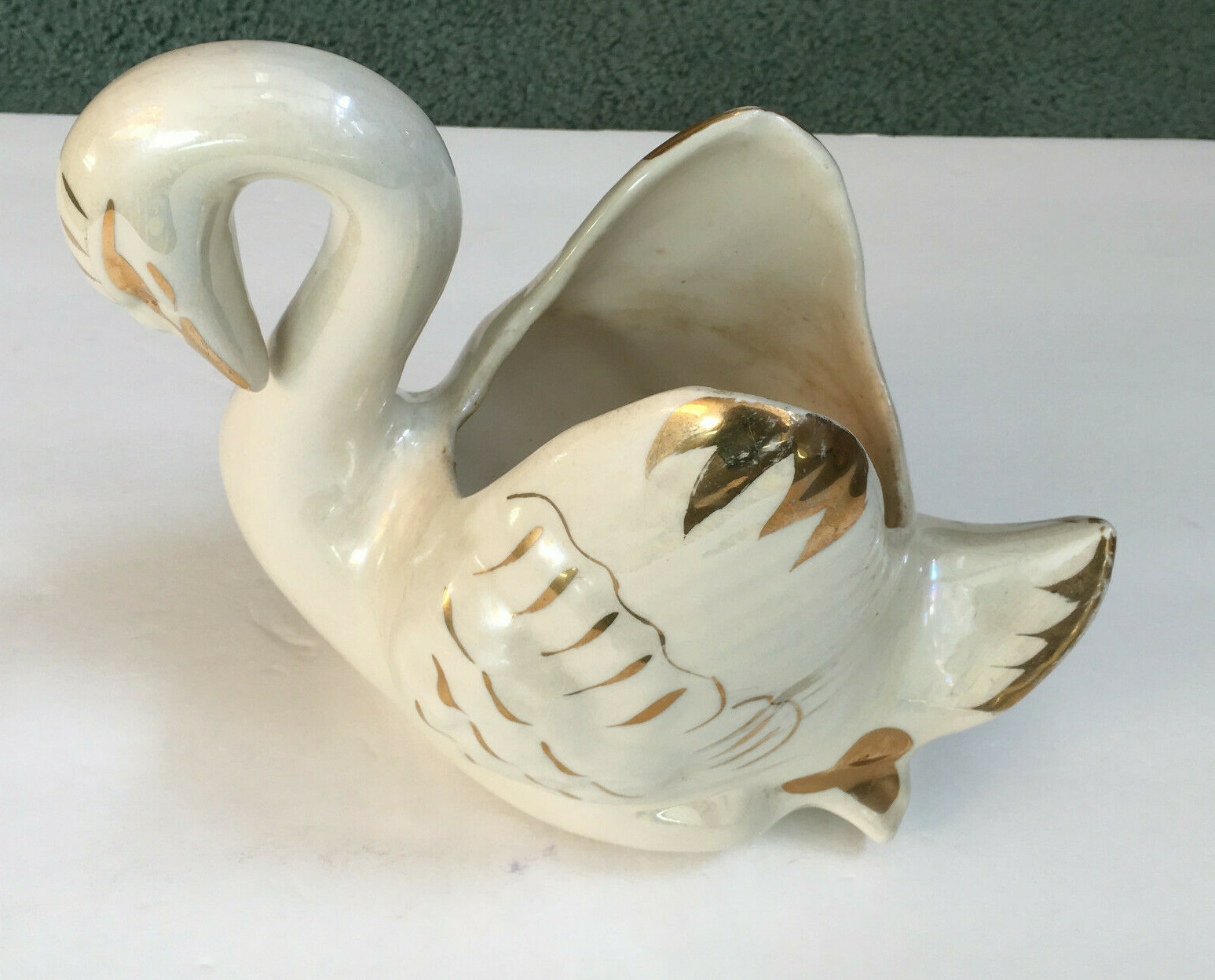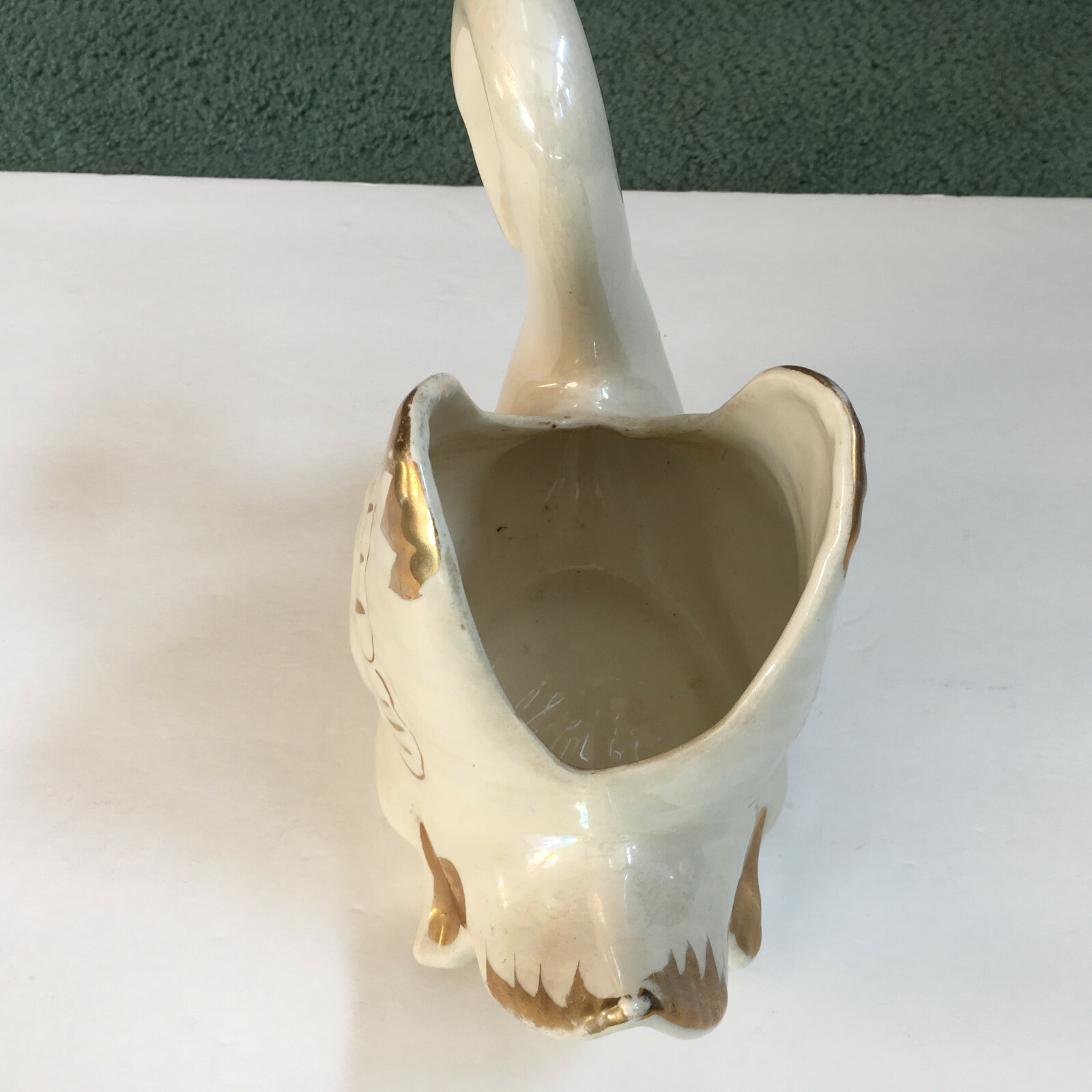Vintage decorative pottery planter white swan gold trim indoor table dislplay